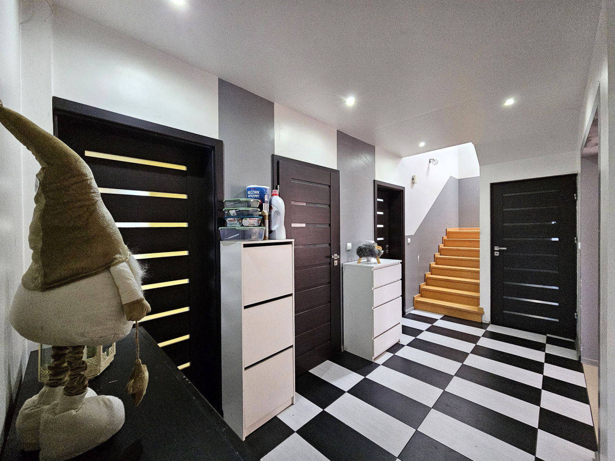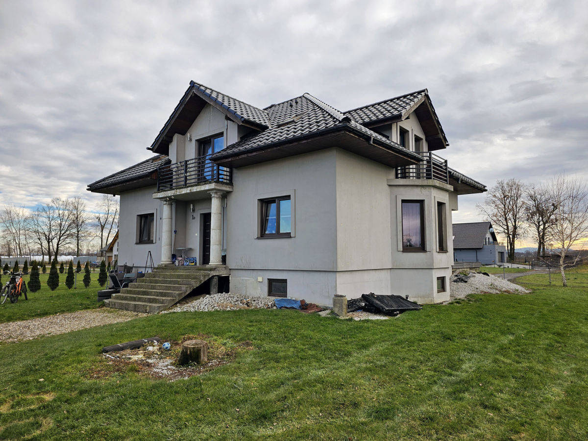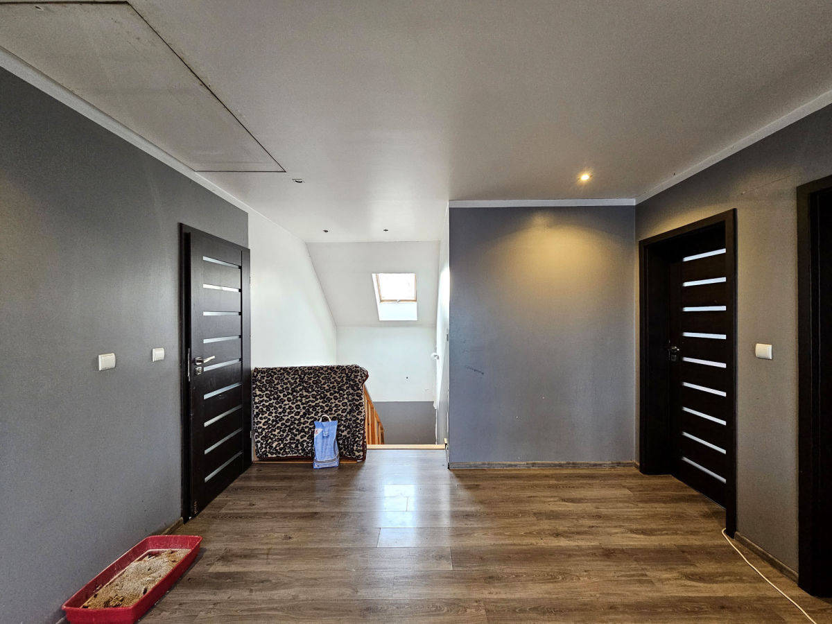 Budynek wymaga jeszcze niektórych prac wykończeniowych, ale jest już zamieszkany i użytkowany. Do wykończenia są przede wszystkim łazienki, część mieszkalna do odświeżenia. Sporo pomieszczeń, na samym parterze poza salonem z aneksem kuchennym są dwa oddzielne pokoje plus łazienka i WC. Na piętrze, poza obszernym hallem, są 3 pokoje sypialne i łazienka.