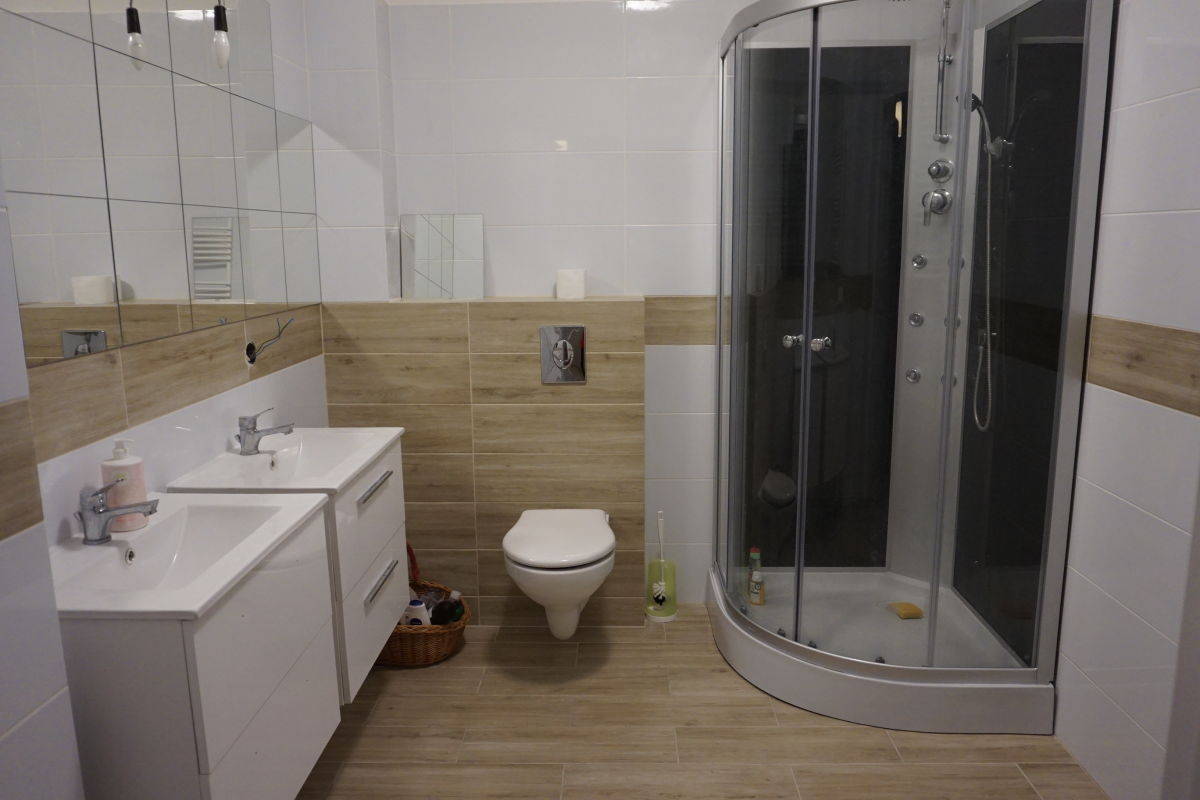 - do wspólnego użytku nowocześnie urządzona i wyposażona kuchnia (nowe sprzęty AGD min. płyta indukcyjna, pełne wyposażenie: naczynia itp.) oraz łazienka z dwoma umywalkami