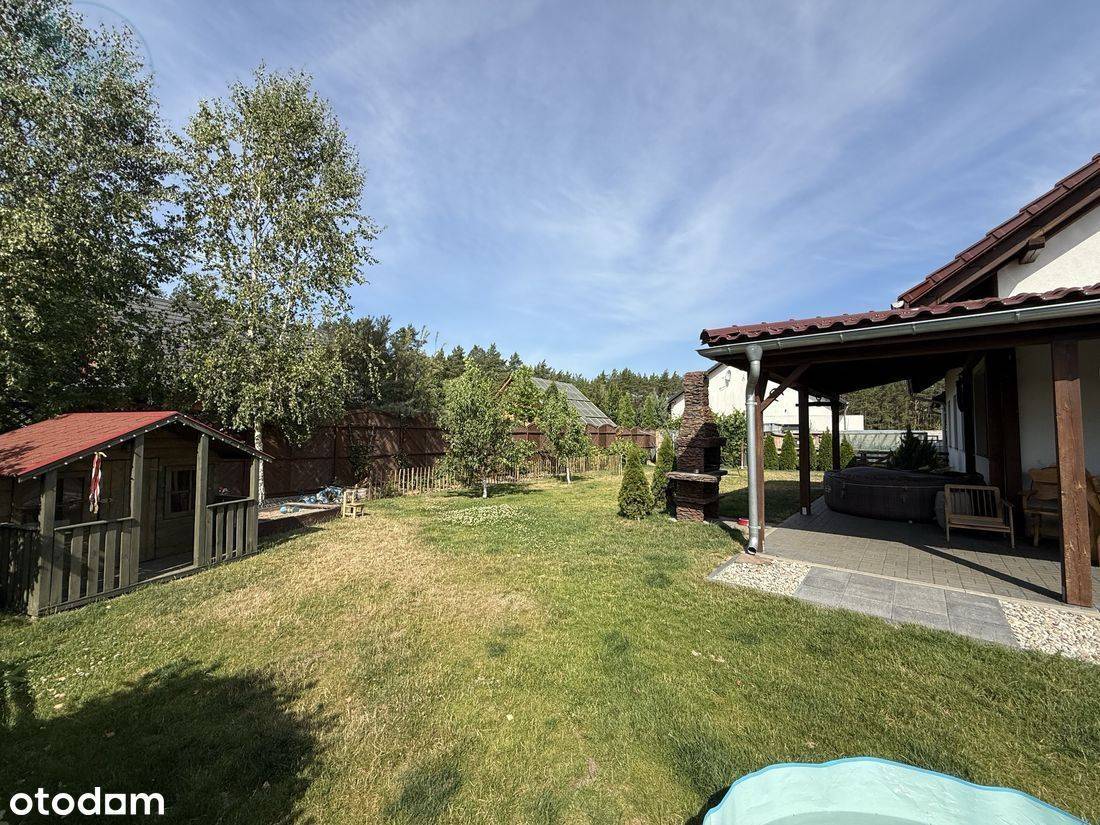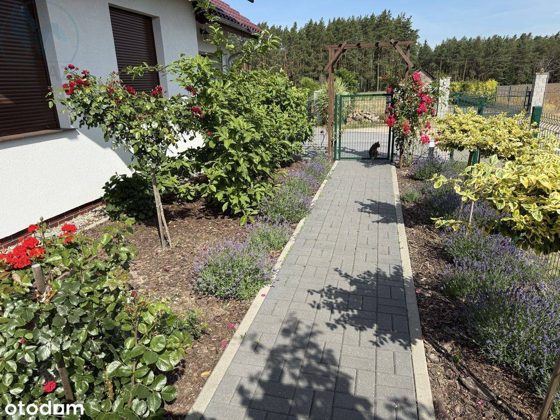 Działka jest w pełni ogrodzona, a wejście oraz podjazd wyłożone kostką brukową. Przepiękne nasadzenia, zadbany ogród oraz zadaszony taras o powierzchni 40 m² z ceramicznym dachem i betonowym grillem tworzą idealne miejsce na relaks i spotkania na świeżym powietrzu. Całość otoczona jest starannie utrzymaną roślinnością, co dodaje uroku i prywatności.