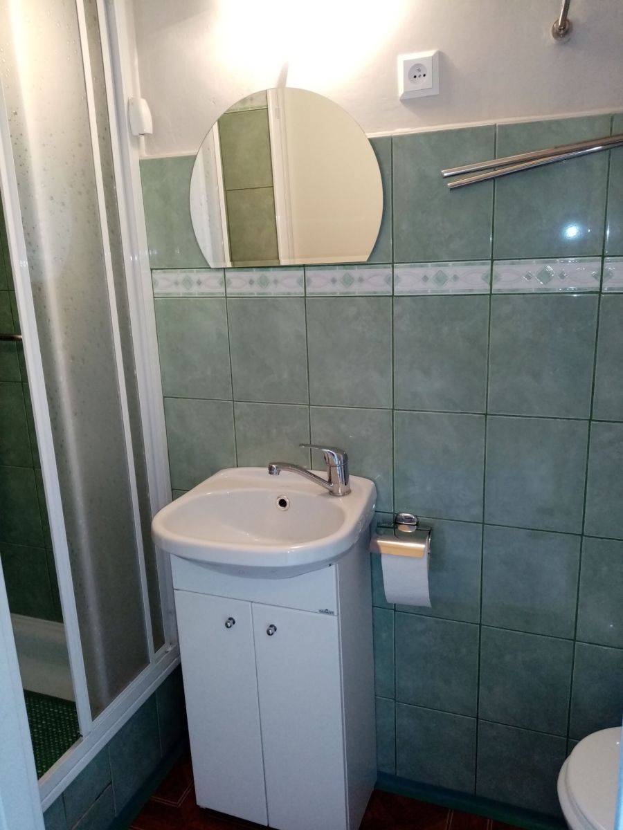 Jest jasne, wysokie (ok. 3m) i zadbane. Okna pcv z wschodnią wystawą. Na podłodze w pokoju wykładzina pcv imitująca deski, w strefie wejściowej i kuchennej płytki ceramiczne, a w strefie jadalni panele. Łazienka w płytkach ceramicznych, wyposażona w kabinę prysznicową i wc-kompakt.