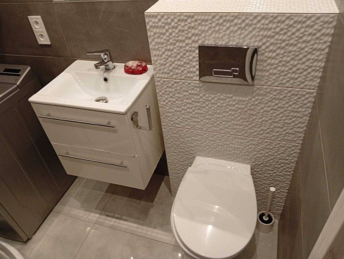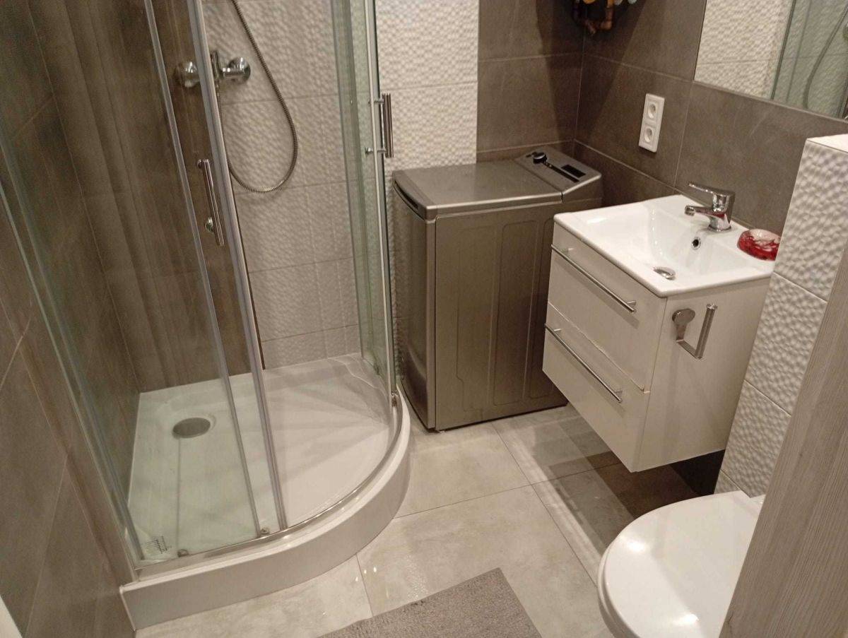 Łazienka w pięknych płytkach ceramicznych wyposażona w kabinę prysznicową, geberit, umywalkę oraz pralkę.