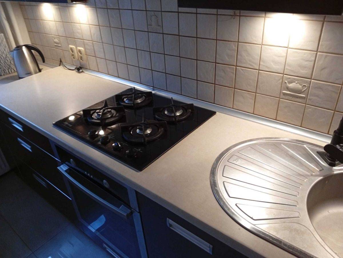 Estetyczna, nowoczesna kuchnia z zabudowanym sprzętem agd - płyta gazowa, piekarnik elektryczny, pochłaniacz, zmywarka i lodówka z zamrażarką. Jest też drobne wyposażenie kuchenne - talerze, garnki, kubki, etc.