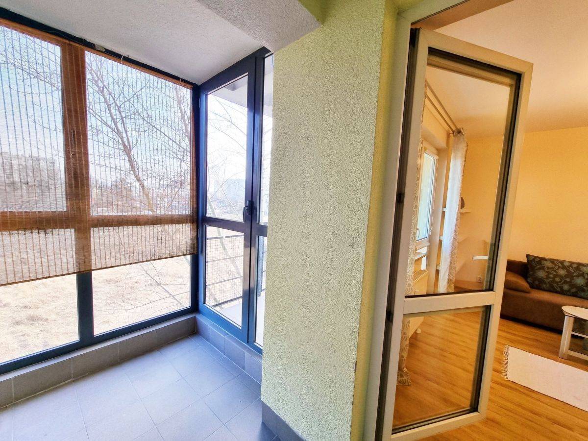 Nowoczesna kawalerka na warszawskim Bemowie, z oddzielnym przeszklonym pomieszczeniem (ogród zimowy).