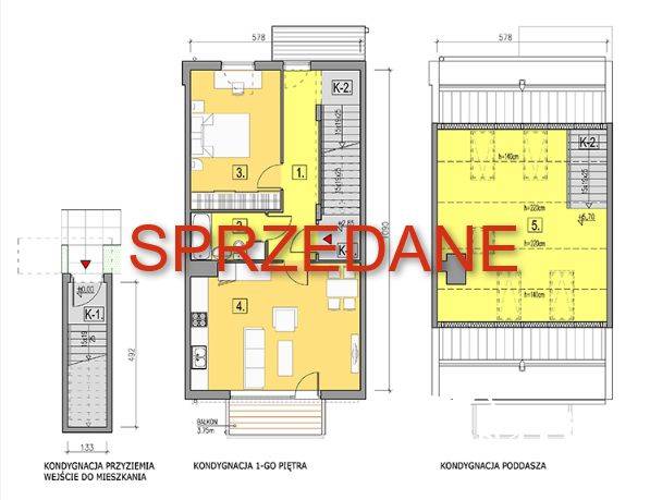 - słonecznego salonu z aneksem kuchennym, potrójnym oknem wertykalnym i wyjściem na balkon,