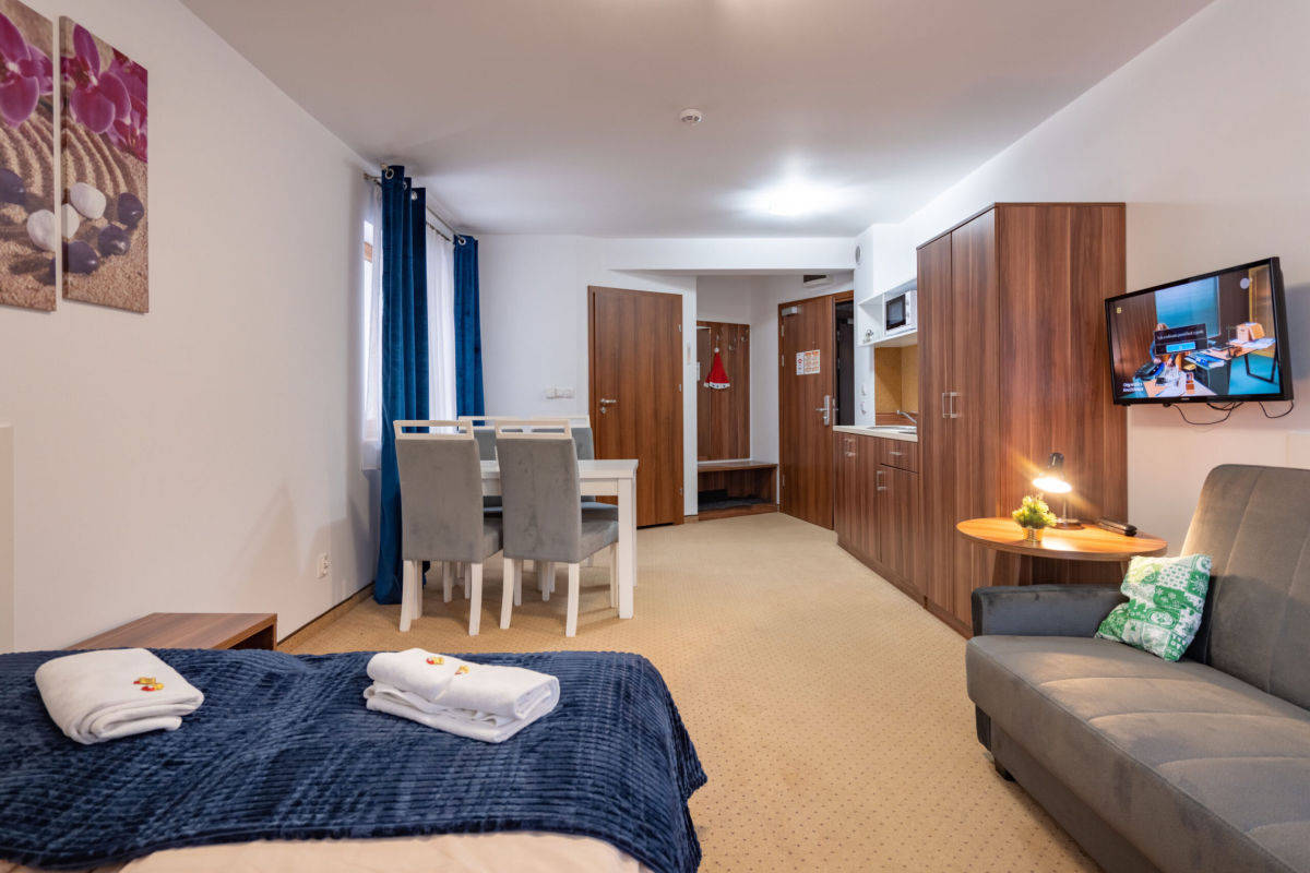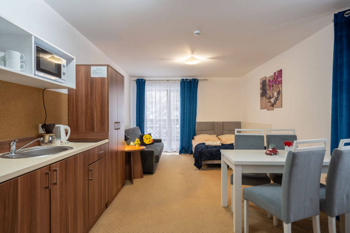 Apartament o pow. 27,07 położony na III piętrze, w pełni urządzony i wyposażony - w apartamencie , łazienka z prysznicem oraz pokój z aneksem kuchennym z: lodówką, płytą indukcyjną, zlewozmywakiem i czajnikiem.