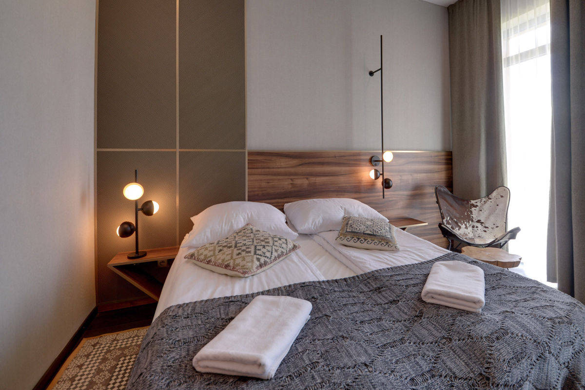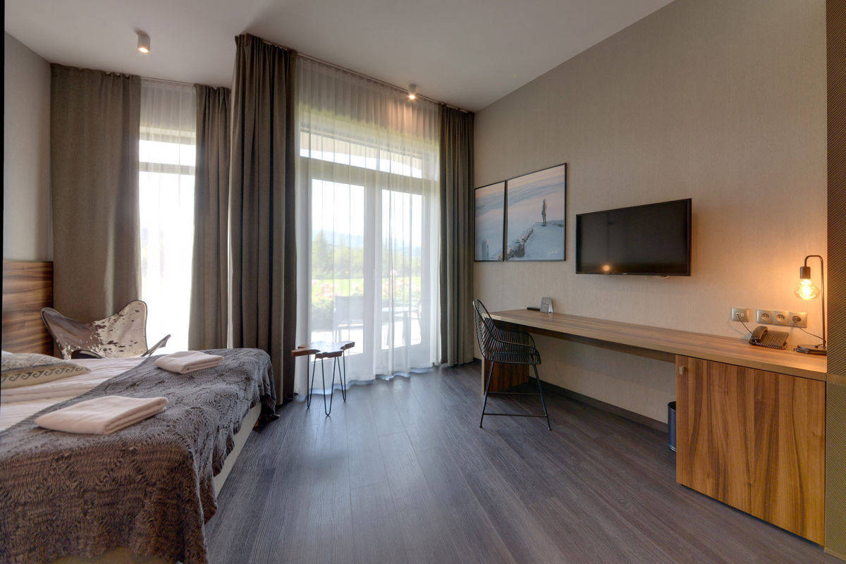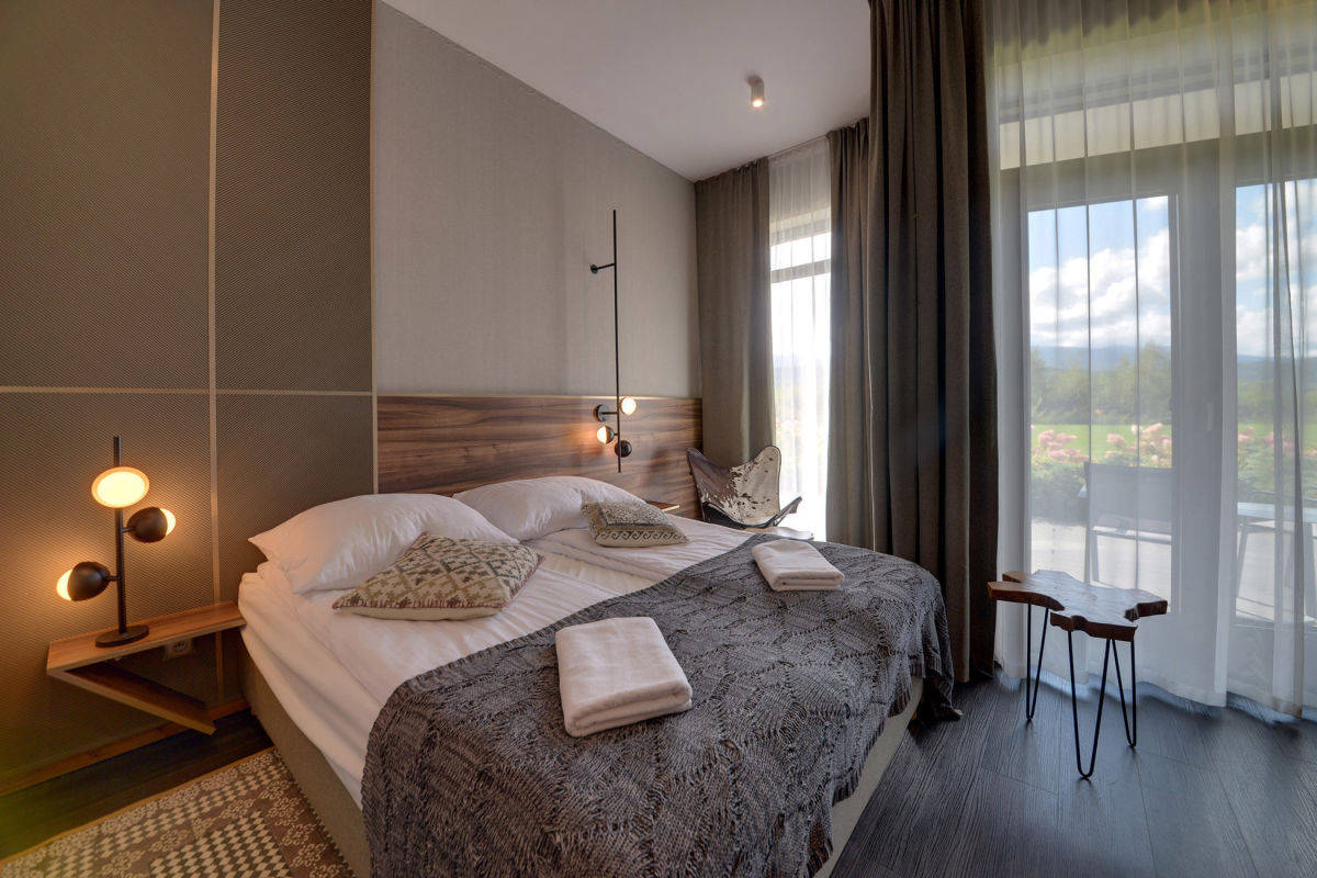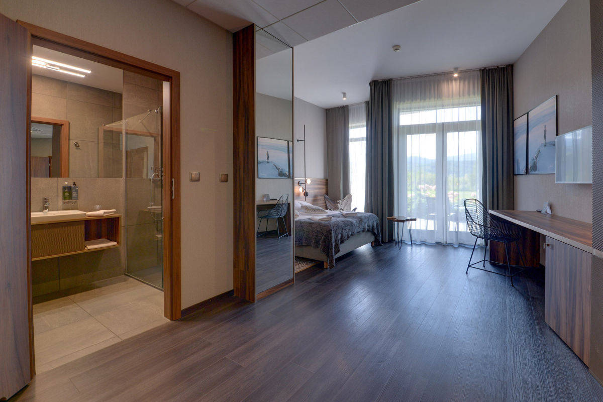 Ten elegancki apartament hotelowy o powierzchni 28,50 m² składa się z przestronnego pokoju oraz stylowej łazienki, zaprojektowanych z najwyższą dbałością o detale. Do nieruchomości przynależy duży taras, z którego rozpościera się zachwycający widok na malowniczy zalew i góry - idealne miejsce na poranną kawę czy wieczorny relaks, ciesząc się piękną panoramą.