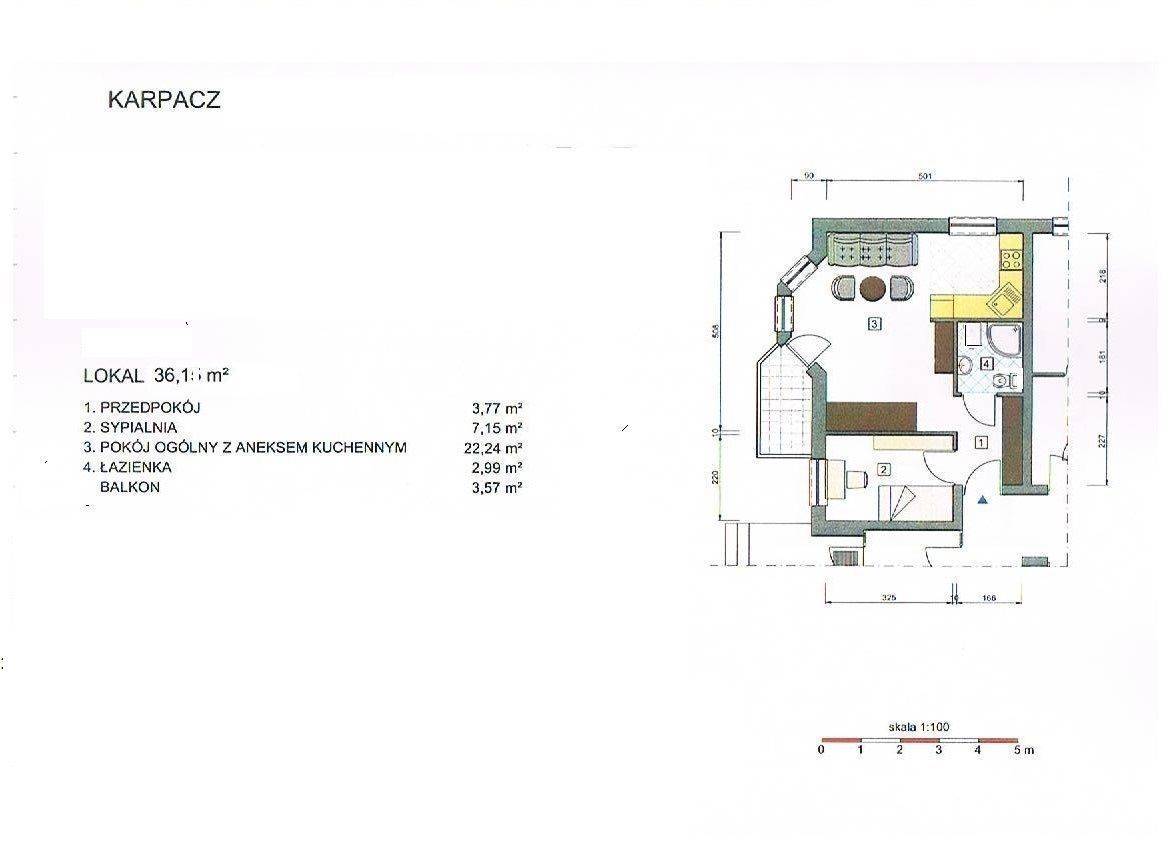 Lokal położony jest w kilkuletnim budynku o atrakcyjnej Karkonoskiej architekturze . Apartament starannie wykończony o powierzchni 36 m2 składa się z przedpokoju , pokoju ogólnego połączonego z aneksem kuchennym , sypialni , łazienki , balkonu , zewnętrznego miejsca postojowego .