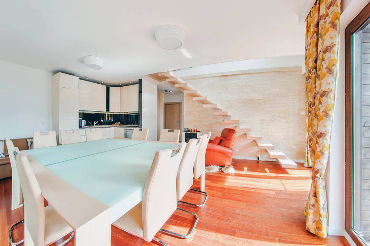 Dwupoziomowy apartament o powierzchni 107,76 m² zachwyca funkcjonalnym układem i dużą ilością naturalnego światła. Na pierwszym poziomie znajdą Państwo przestronny przedpokój, elegancką łazienkę z natryskiem, komfortową sypialnię oraz nowoczesną kuchnię - idealne miejsce do codziennego wypoczynku i spotkań z bliskimi. Na drugim poziomie czeka na Państwa rozległy, jasny salon, kolejna przytulna sypialnia oraz dodatkowa łazienka, zapewniająca wygodę i prywatność.