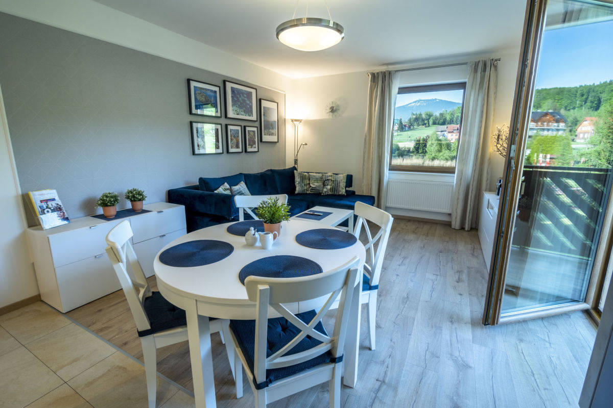 Nowoczesny, stylowy budynek wyróżnia się elegancką, nowoczesną klatką schodową i zadbaną posesją, zapewniającą spokój i bezpieczeństwo. Z okien rozpościera się przepiękny widok na całe pasmo Karkonoszy, co czyni to miejsce jeszcze bardziej atrakcyjnym.