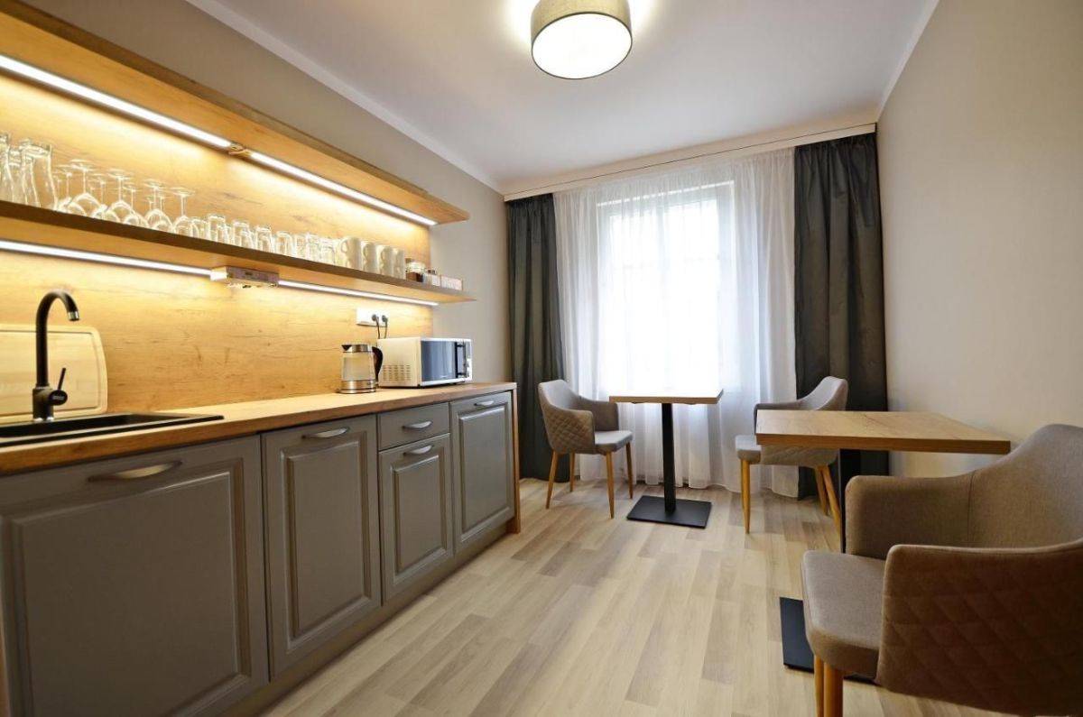 Na II piętrze 3 pokoje z łazienkami i małą kuchnię ogólnodostępną.