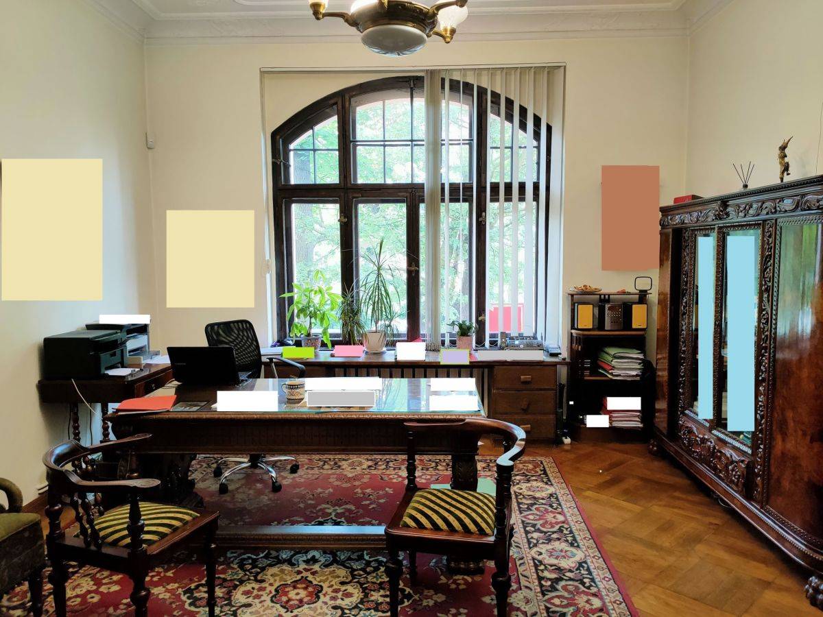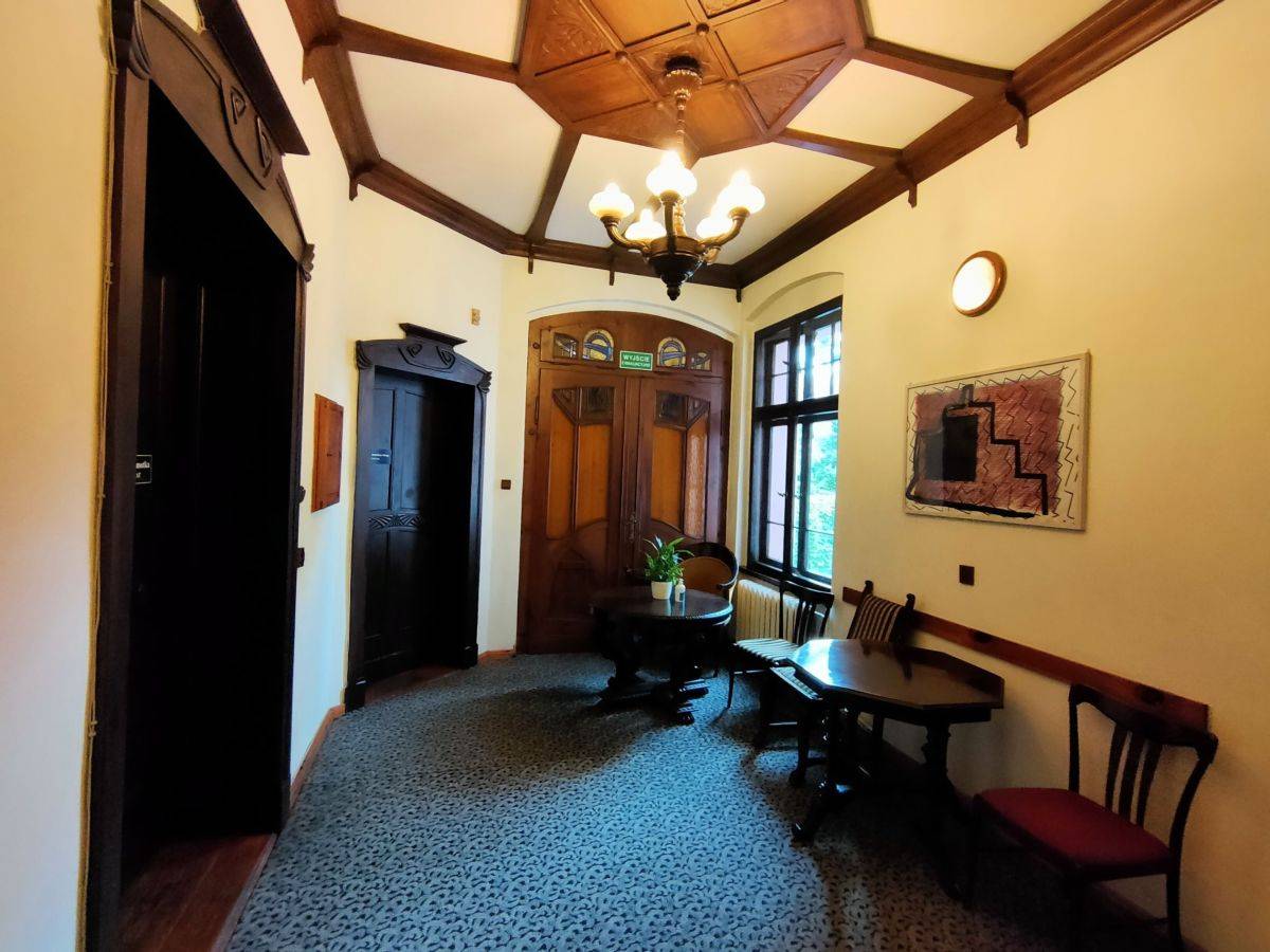 W lokalu zachowane zostały oryginalna stolarka drzwiowa i okienna, przepiękne sztukaterie i drewniane zdobienia sufitu. Podłogi w przeważającej części drewniane (parkiet i deski).