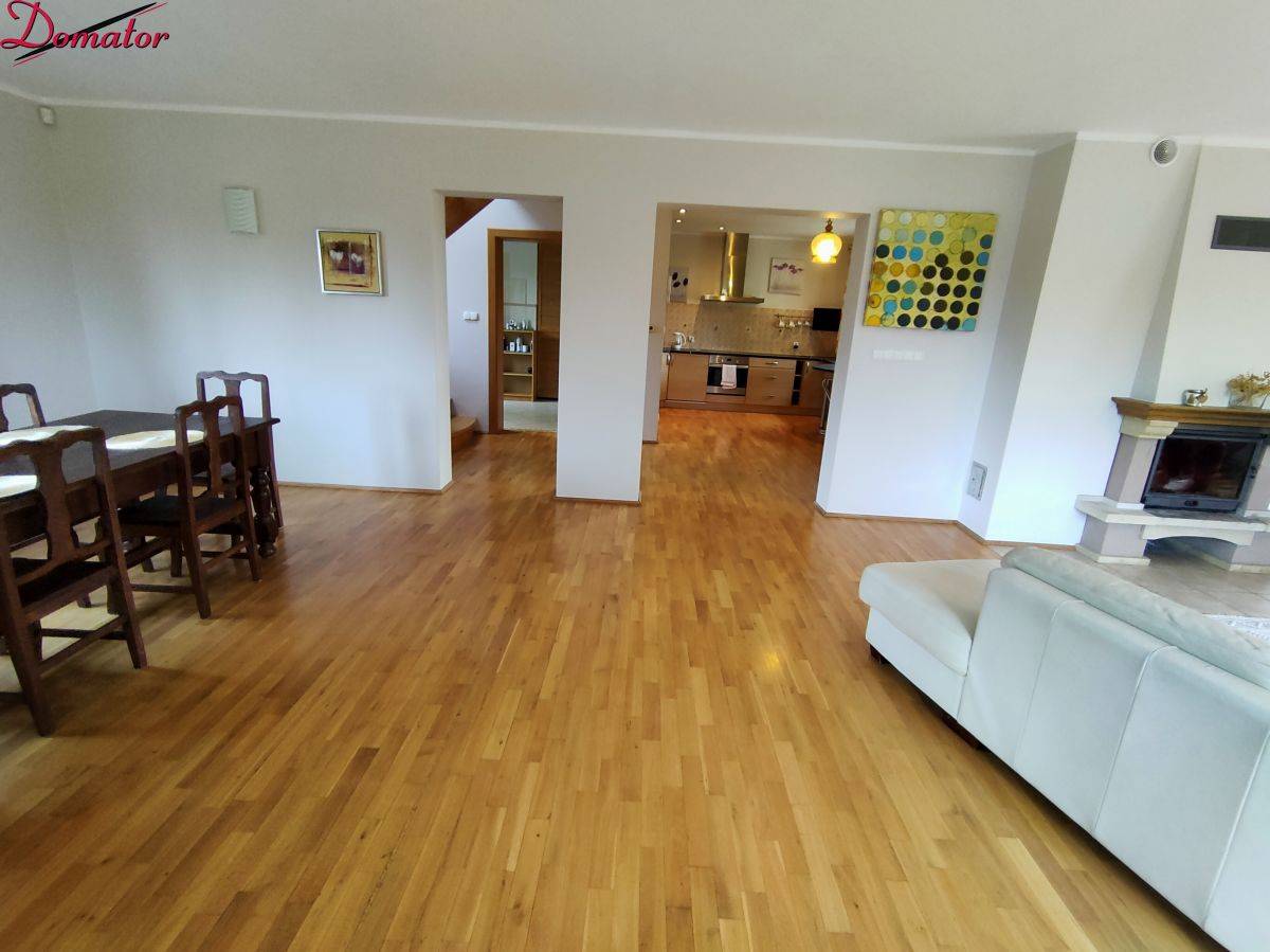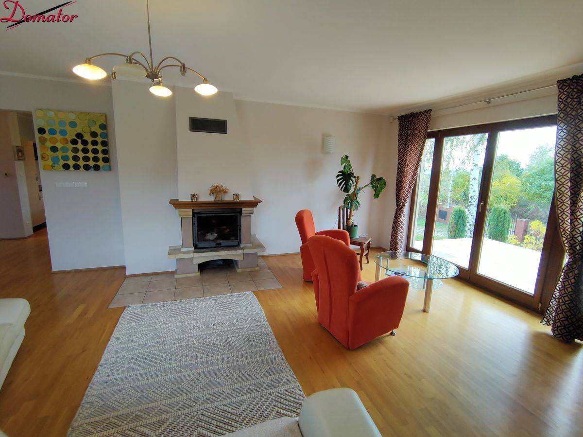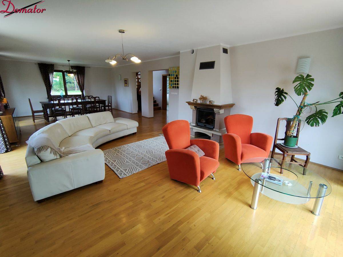 Duży salon z częścią jadalną i kuchnią w otwartym układzie, z salonu dwa wyjścia na tarasy, łazienka, w salonie kominek.