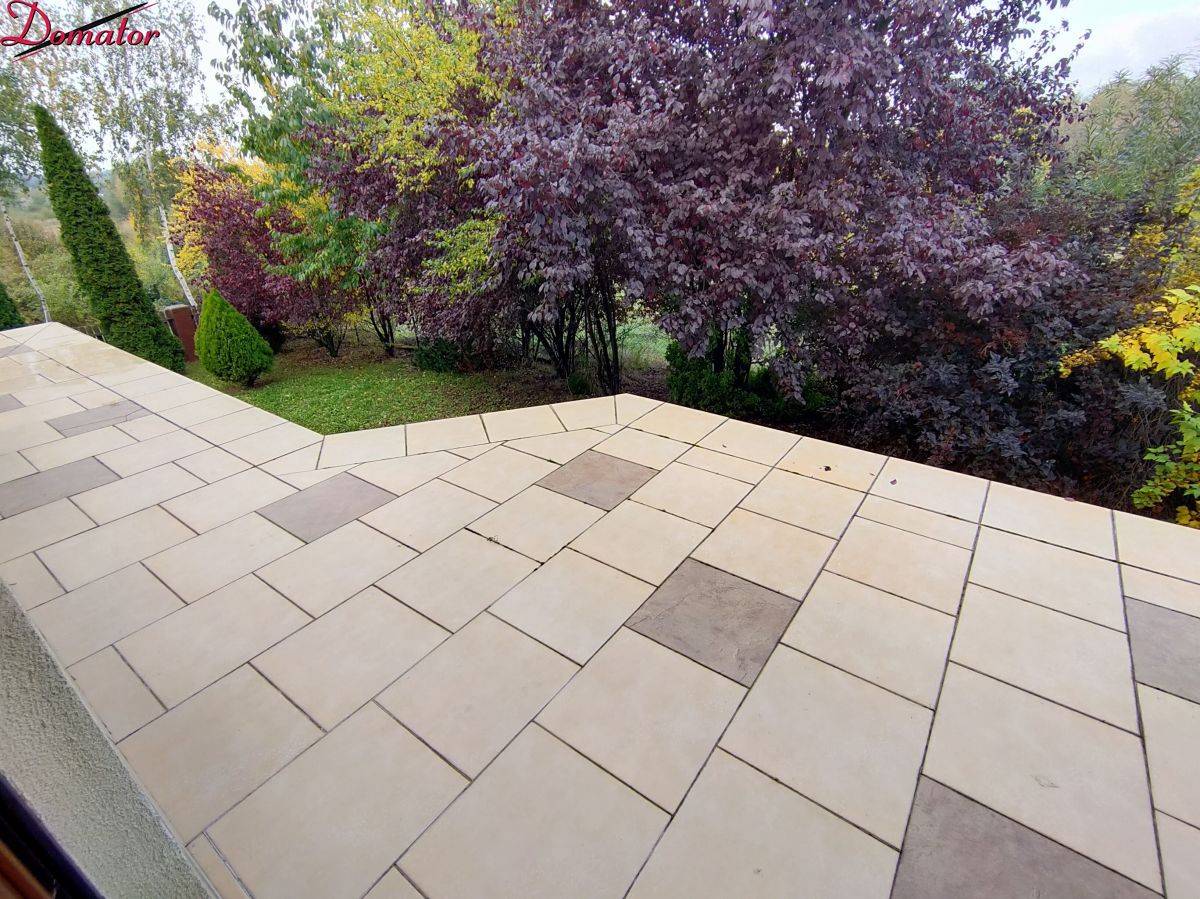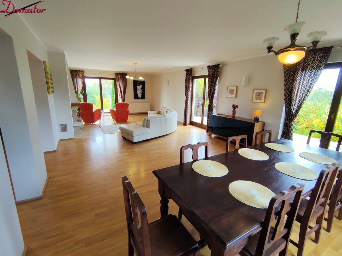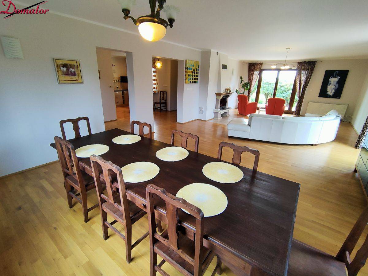 Duży salon z częścią jadalną i kuchnią w otwartym układzie, z salonu dwa wyjścia na tarasy, łazienka, w salonie kominek.