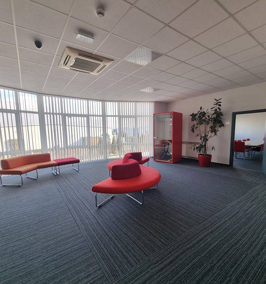 Przy hali znajduje się murowany biurowiec, wykończony w bardzo dobrym standardzie. Pomieszczenia biurowo-socjalne są klimatyzowane. Istnieje możliwość wynajęcia pomieszczeń biurowych umeblowanych ( w bardzo dobrym standardzie )