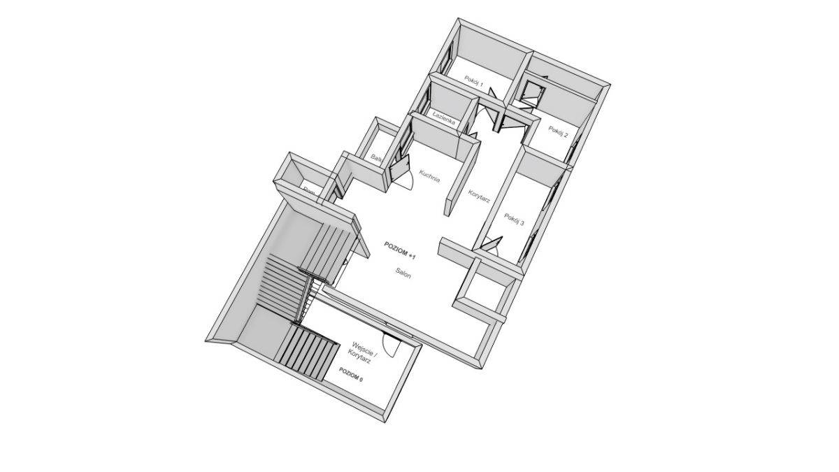 Mieszkanie jest dwupoziomowe. Z przedpokoju wchodzimy po drewnianych schodach na piętro, dalej jest holl i wejścia do 3 nieprzechodnich pokoi. Z kuchni wejście na balkon z przepięknym widokiem na Rynek.
