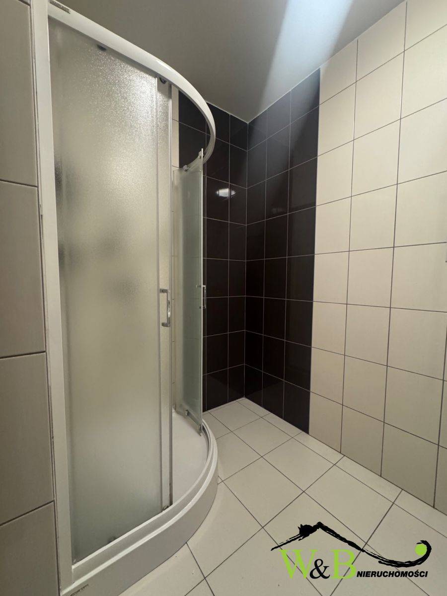 - w łazience kabina prysznicowa, meble łazienkowe, pralka