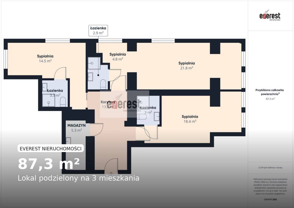 Lokal został podzielony na 3 apartamenty, każdy ze swoją łazienką.