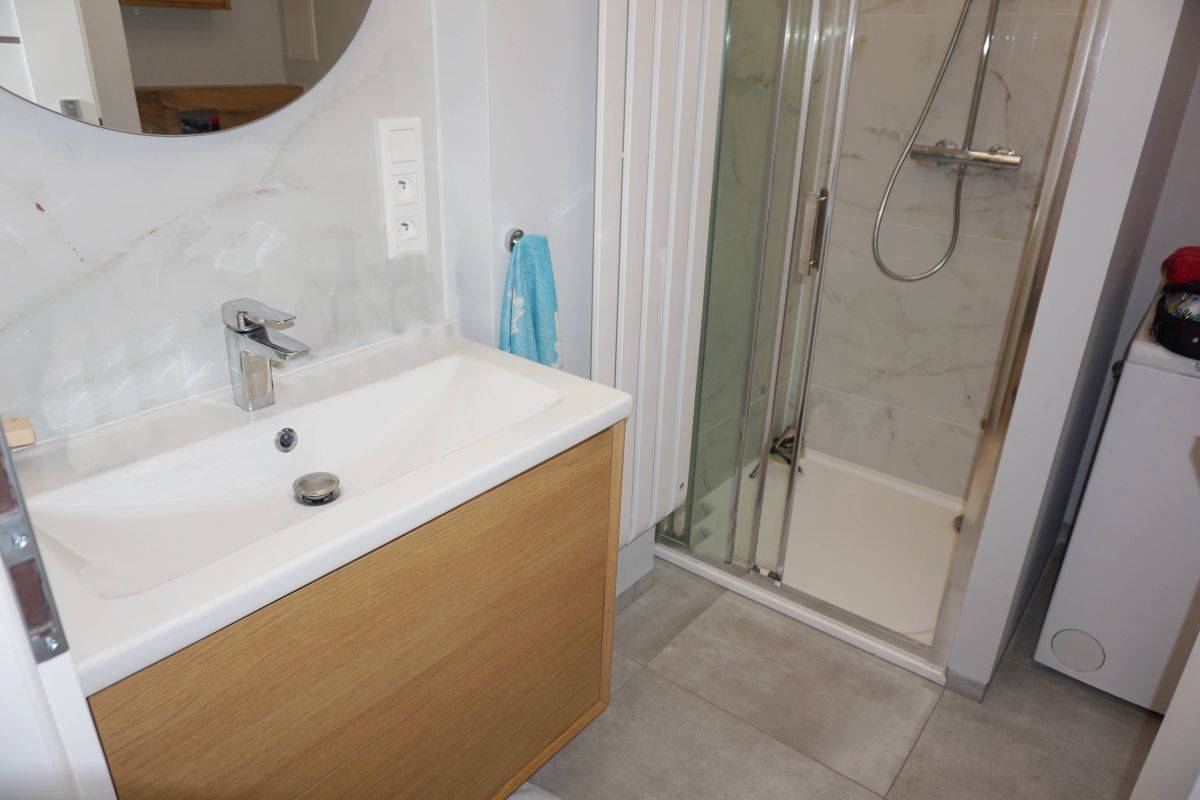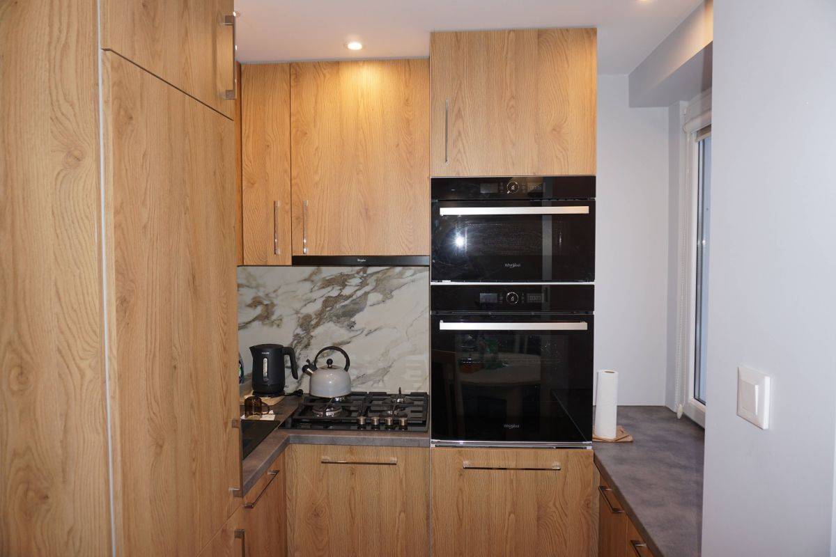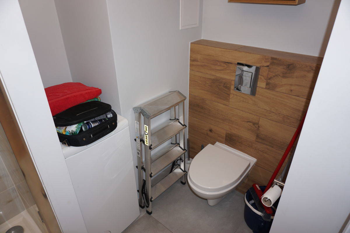 Kuchnia umeblowana z kuchenką gazową i elektrycznym piekarnikiem, okapem i lodówką. Łazienka z prysznicem i pralką.