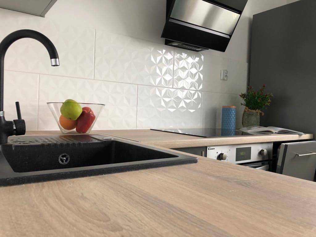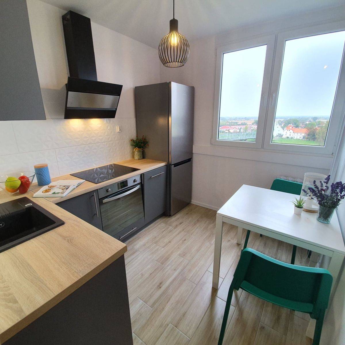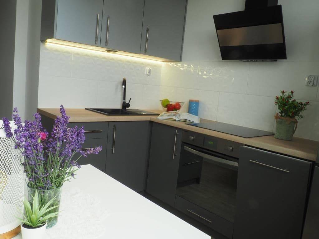 - jasnej w pełni wyposażonej kuchni z meblami na wymiar i nowymi sprzętami agd (min. płyta indukcyjna, piekarnik, zmywarka, lodówka)