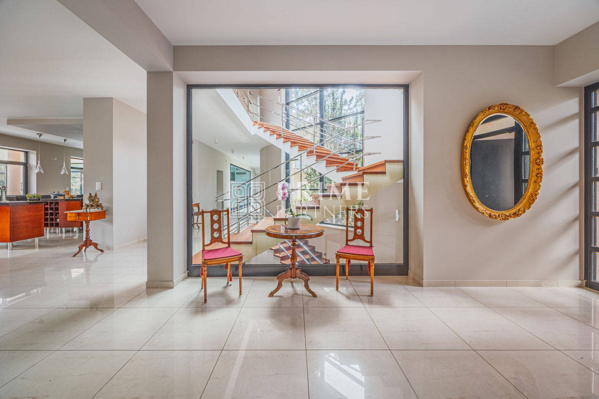 Ta luksusowa rezydencja powstała z najwyższej klasy materiałów, łącząc estetykę z funkcjonalnością. Wysokie sufity podkreślają poczucie przestrzeni i dodają wnętrzom wyjątkowego charakteru, a duże przeszklenia zapewniają obfite naturalne światło, które wprowadza do domu ciepło i harmonię. Wnętrza zachwycają perfekcyjną stolarką, która nadaje im unikalny styl i elegancki charakter. Aby zapewnić mieszkańcom pełen komfort, w domu zamontowano nowoczesną klimatyzację, umożliwiającą utrzymanie idealnego klimatu niezależnie od pory roku.