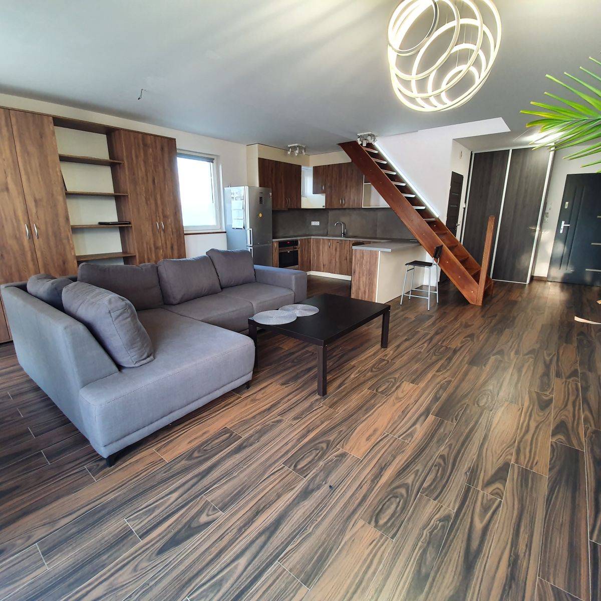 Na pierwszym poziome znajduje się przestronny, ponad 30 metrowy salon z aneksem kuchennym i wyjściem na balkon oraz łazienka oraz hol.