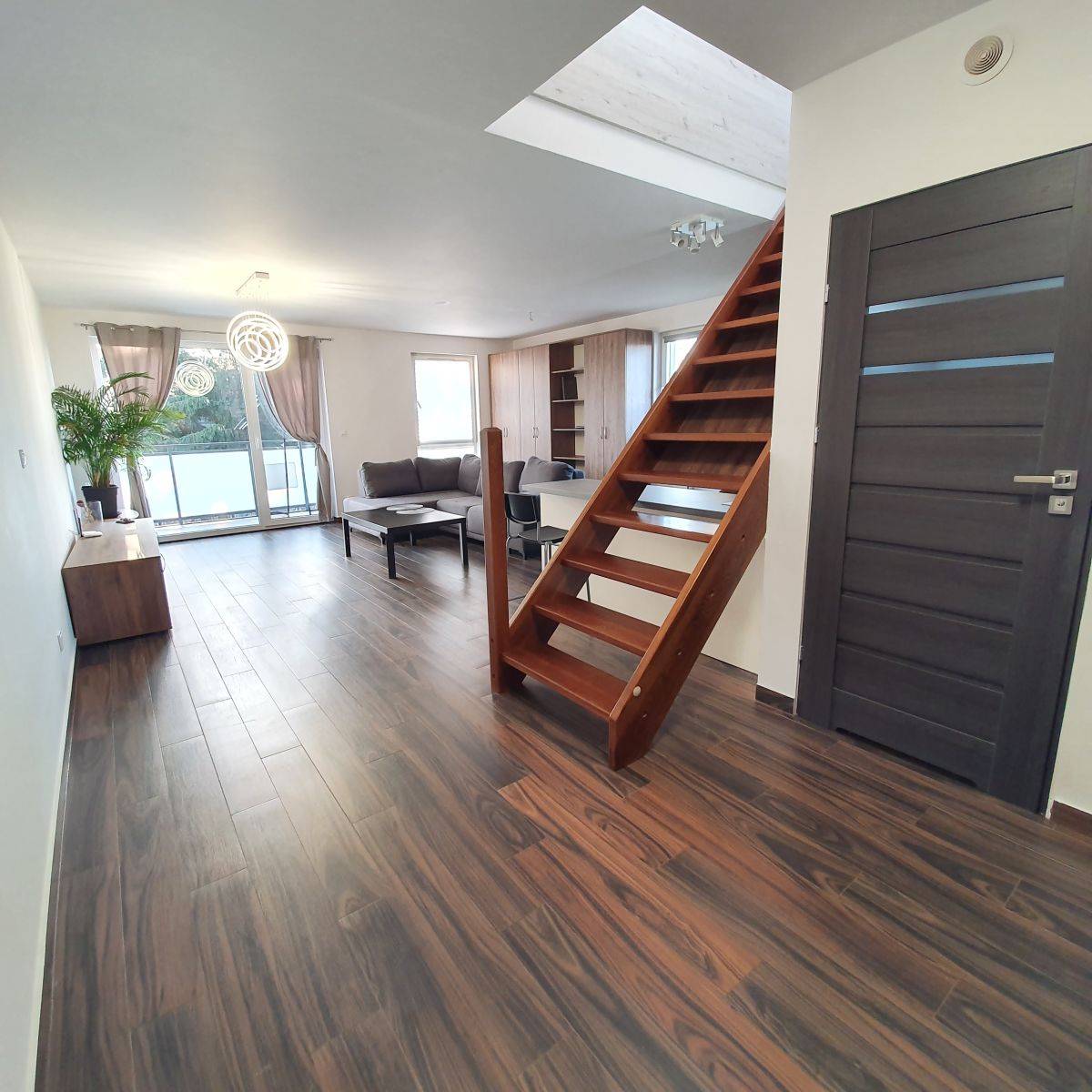 Rozkład mieszkania zapewnia dużo światła i przestrzeni, a odrębne wejście do budynku zapewnia prywatność.