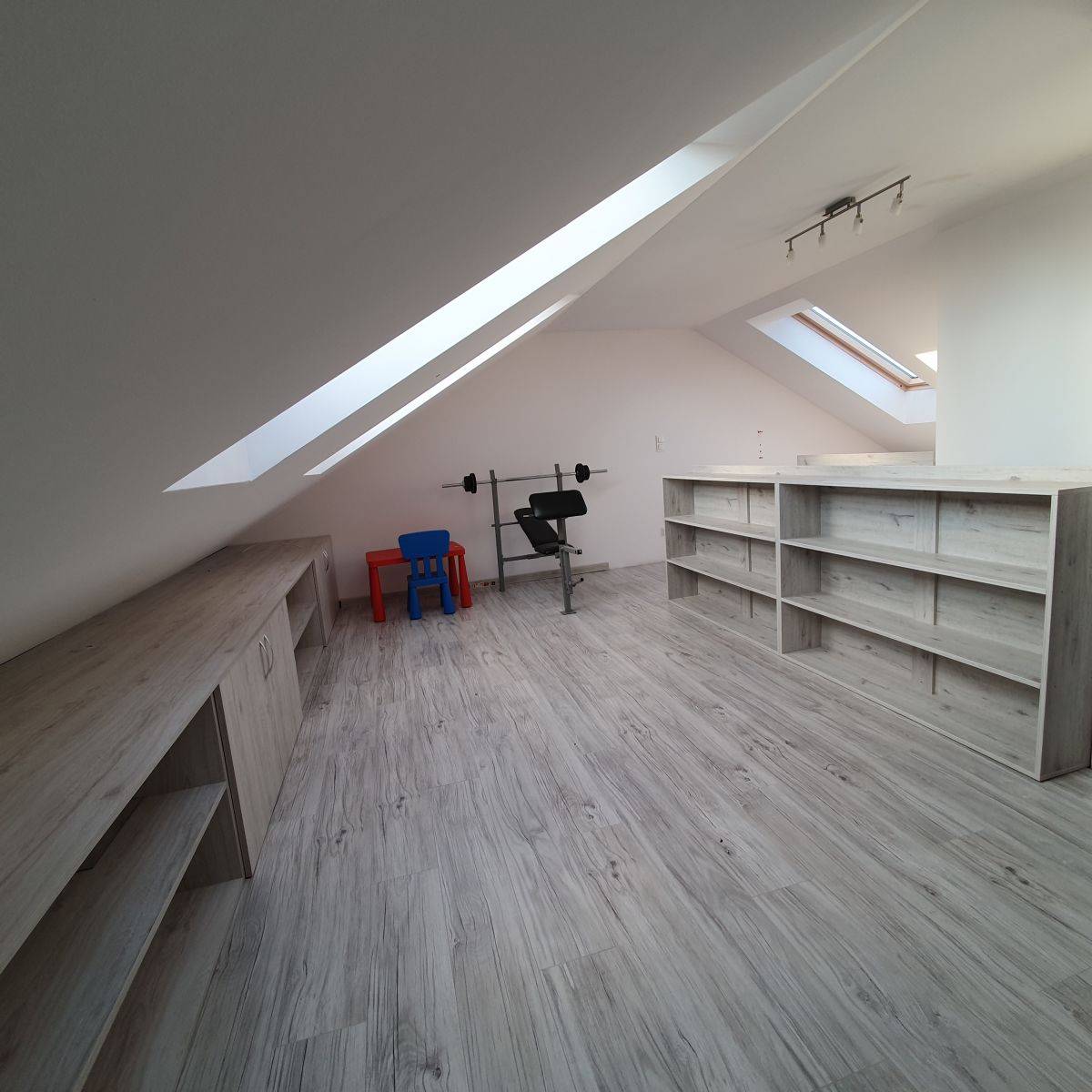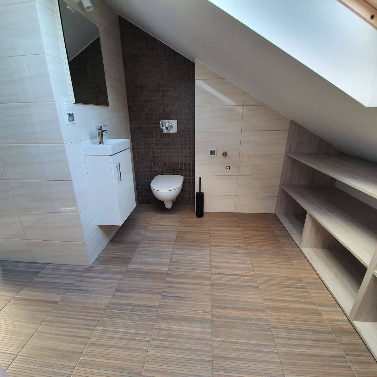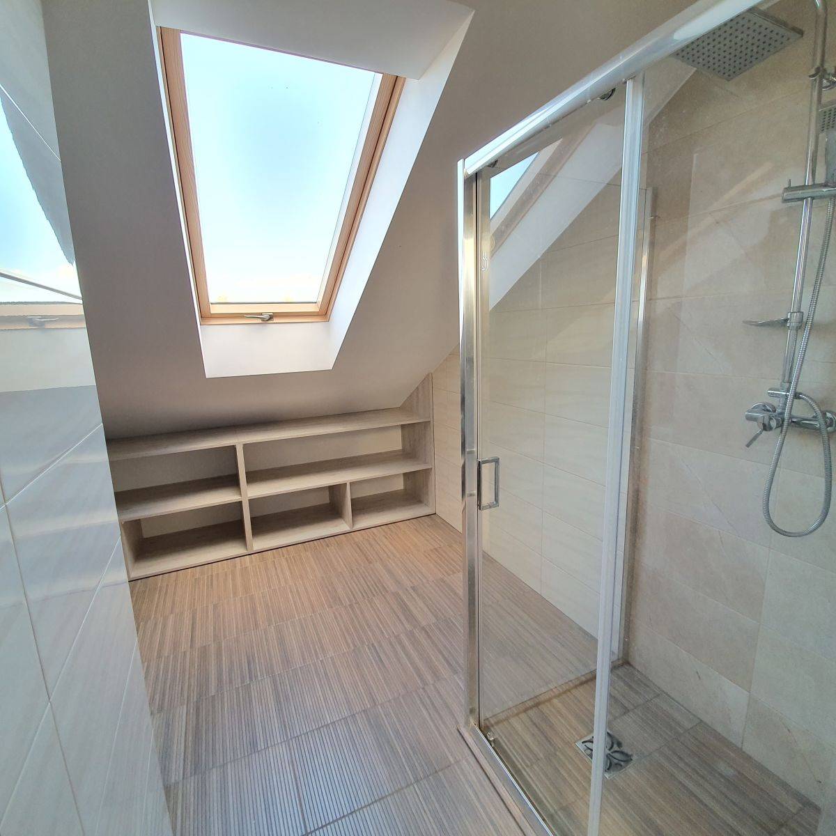 Na piętrze duża jasna antresola pełniąca funkcję sypialni z dodatkową łazienką.