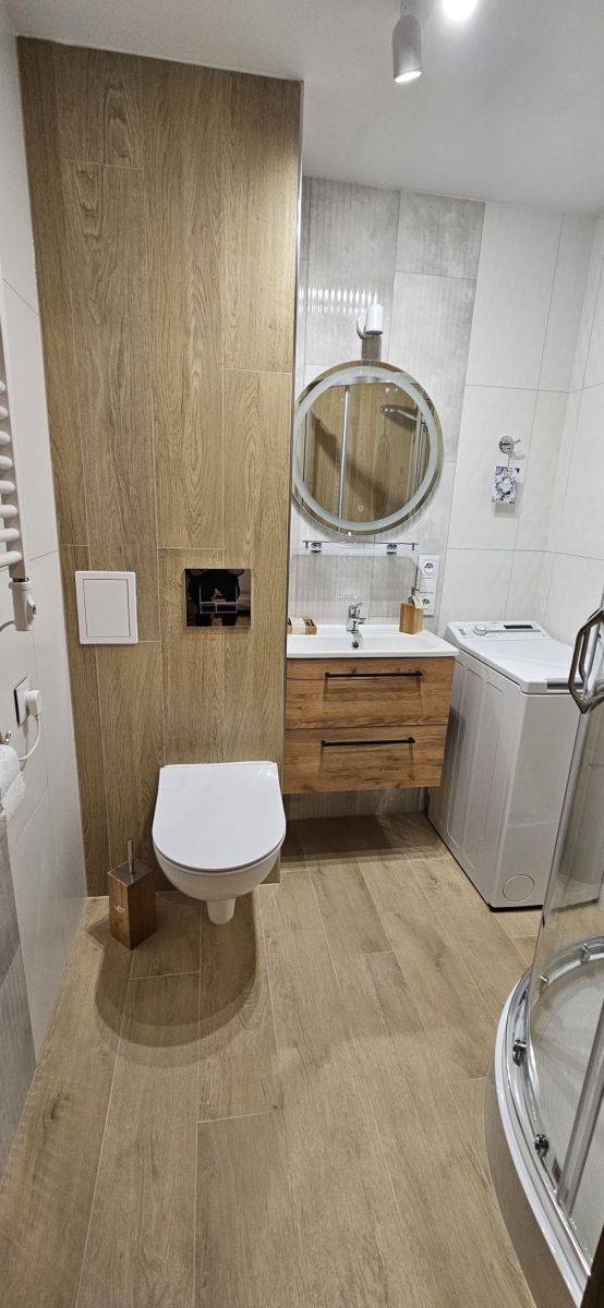 Łazienka z prysznicem, pralka.