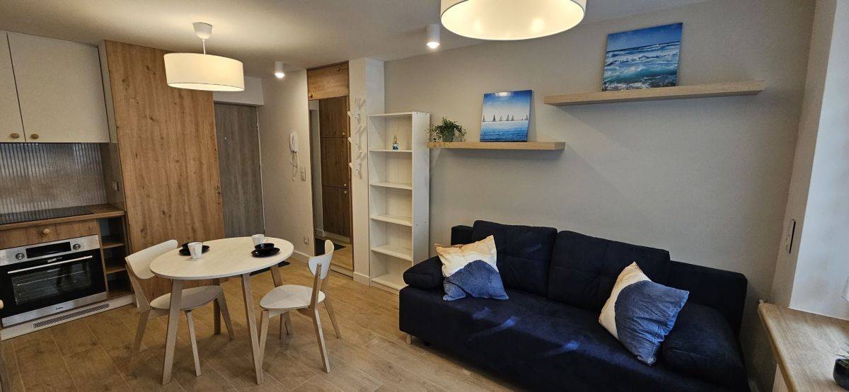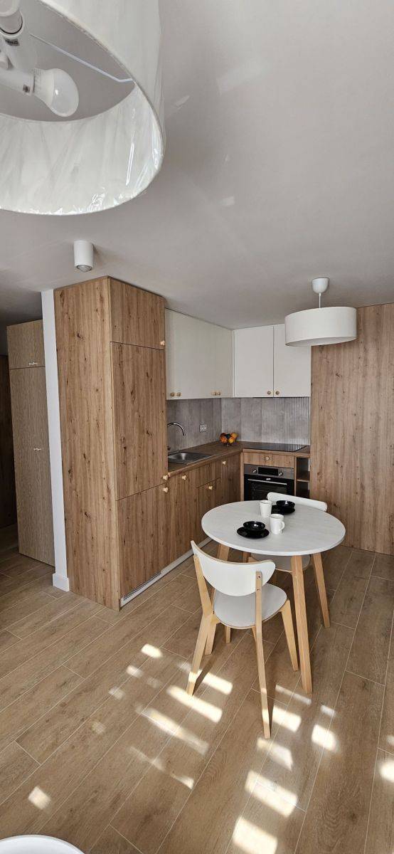 Mieszkanie w pełni wyposażone i umeblowane. Kuchnia w zabudowie, sprzęt AGD: płyta indukcyjna, piekarnik, zmywarka, lodówka, okap, stół z krzesłami.