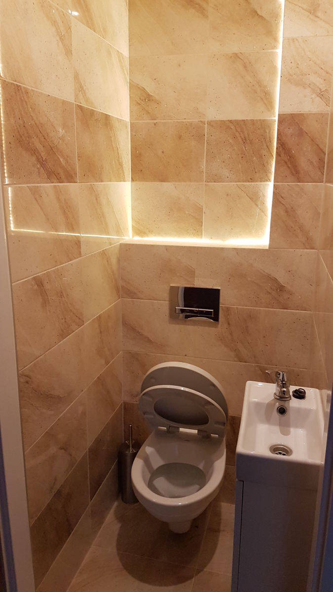 Parter : kuchnia, pokój dzienny, WC, przedpokój, przedsionek i mały schowek pod schodami.