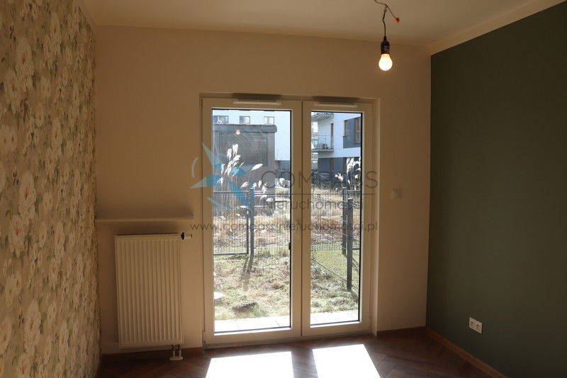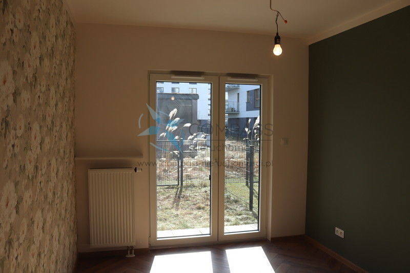 - Mniejszy jasny pokój z wyjściem do ogródka oraz dużą, funkcjonalną szafą na wymiar, oferującą dużo miejsca do przechowywania.