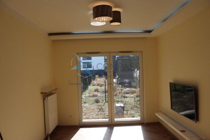 - Jasny, słoneczny salon z bezpośrednim wyjściem do własnego ogródka, wyposażony w telewizor, półki naścienne oraz komfortowe miejsce do wypoczynku.