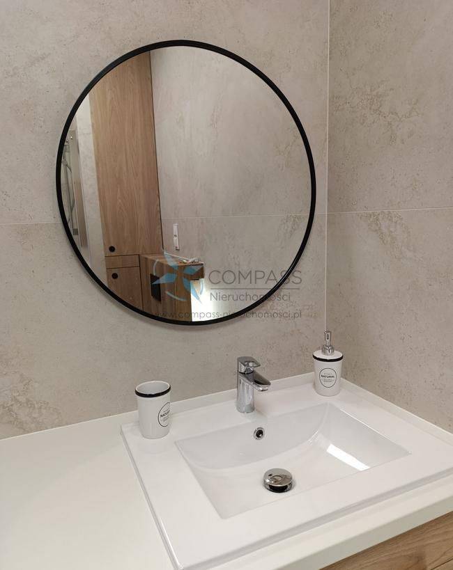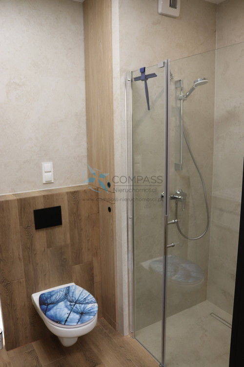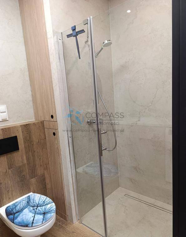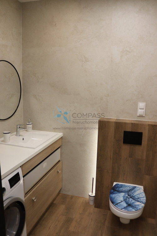 - Elegancka łazienka z nowoczesną szklaną kabiną prysznicową, umywalką,lustrem, WC oraz nowoczesną pralką.