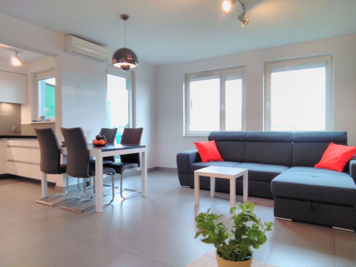 Mieszkanie jest w pełni umeblowane i wyposażone, kuchnia z zabudową oraz kompletnym sprzętem AGD. Salon z dużą narożną sofą gwarantuje komfortowy odpoczynek. Na podłogach w pokoju dziennym naturalny kamień, całość utrzymana w jasnych, naturalnych kolorach, które nadają wnętrzu przytulny i elegancki charakter.