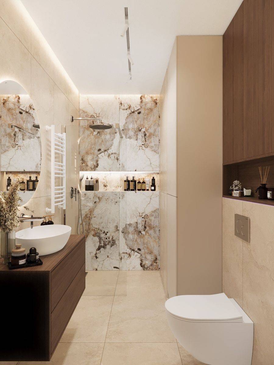 - Elegancką łazienkę z dużym prysznicem, wykończoną wysokiej jakości materiałami i gustownymi detalami