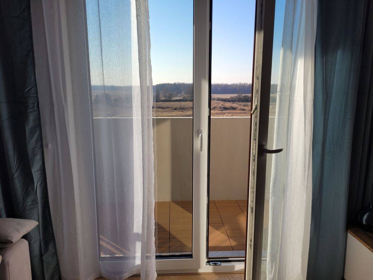 Balkon - doskonałe miejsce na poranną kawę z widokiem na lasek i pola, które można podziwiać z okien.