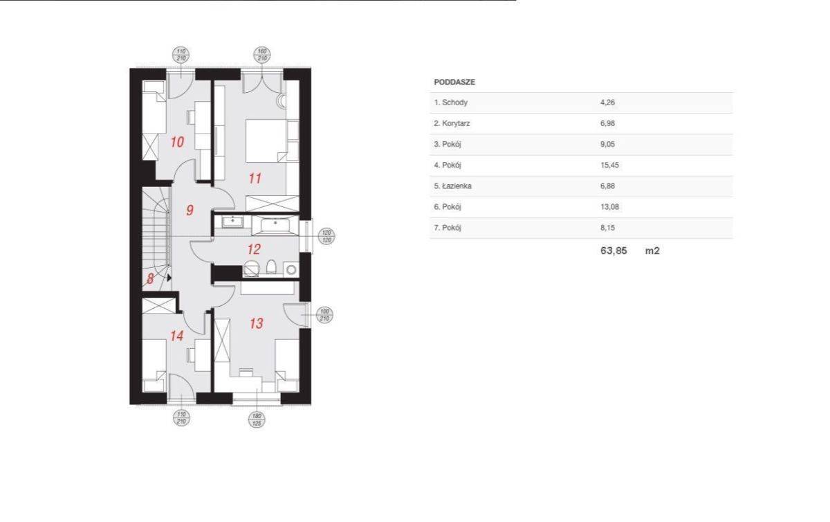 Dodatkowa przestrzeń na poddaszu (strychu) o powierzchni około 30-35 m², z wysokością 3,1 m w szczycie, umożliwia własną aranżację — np. stworzenie dodatkowego pokoju, gabinetu czy przestrzeni rekreacyjnej.