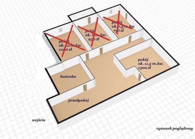 Aktualnie mieszkanie zamieszkuje dwóch chłopaków i dziewczyna, wynajmują pokoje jednoosobowe.