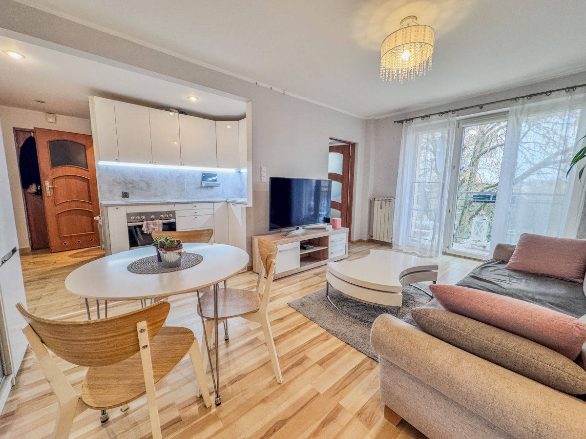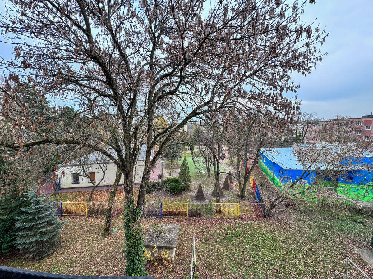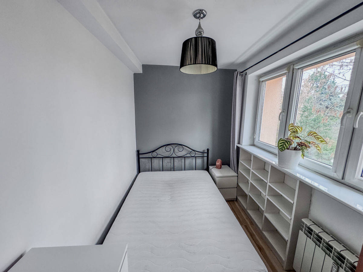 Pierwotnie kawalerka, po modernizacji uzyskano funkcjonalny układ: salon z aneksem kuchennym i wyjściem na balkon oraz osobną sypialnię. Okna PCV - wymienione, skierowane na południowy wschód, z widokiem na zieleń. Podłogi: panele w pokojach. Ściany: gładzie gipsowe. Aneks kuchenny: zabudowa na wymiar, piekarnik, płyta indukcyjna, zlew, lodówka wolnostojąca. Łazienka: kabina prysznicowa, całość w kaflach.