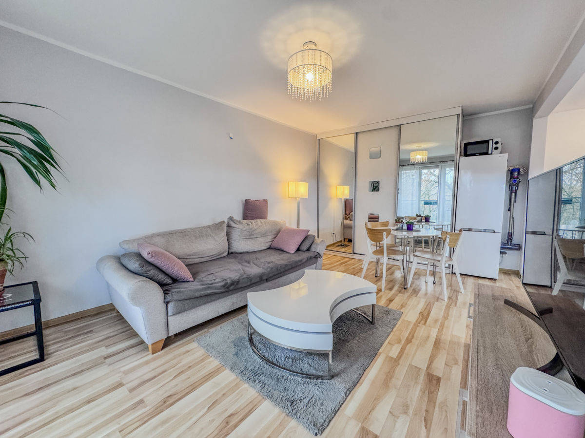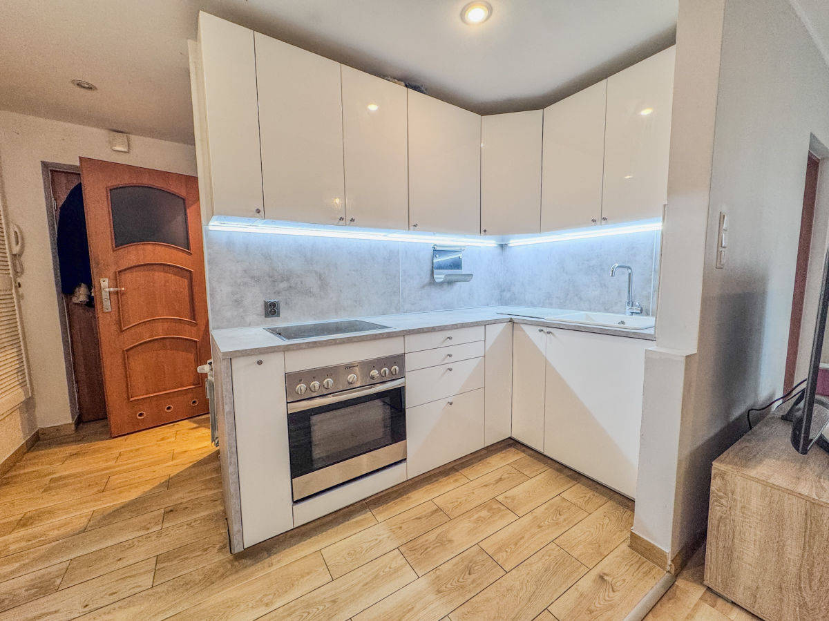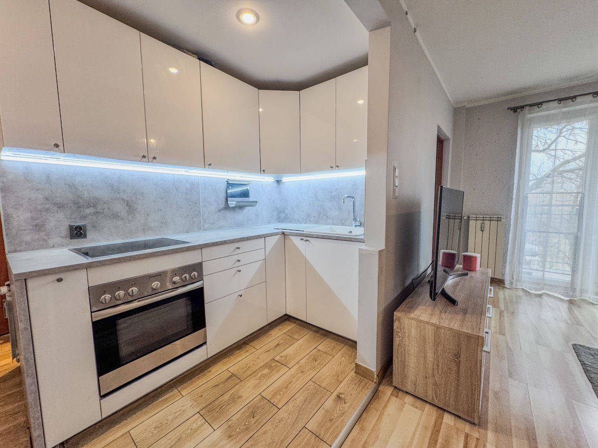 Pierwotnie kawalerka, po modernizacji uzyskano funkcjonalny układ: salon z aneksem kuchennym i wyjściem na balkon oraz osobną sypialnię. Okna PCV - wymienione, skierowane na południowy wschód, z widokiem na zieleń. Podłogi: panele w pokojach. Ściany: gładzie gipsowe. Aneks kuchenny: zabudowa na wymiar, piekarnik, płyta indukcyjna, zlew, lodówka wolnostojąca. Łazienka: kabina prysznicowa, całość w kaflach.