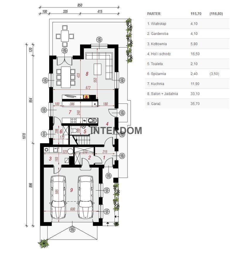 - Parter- salon połączony z kuchnią i jadalnią, toaleta, garderoba, kotłownia, garaż dwustanowiskowy,
