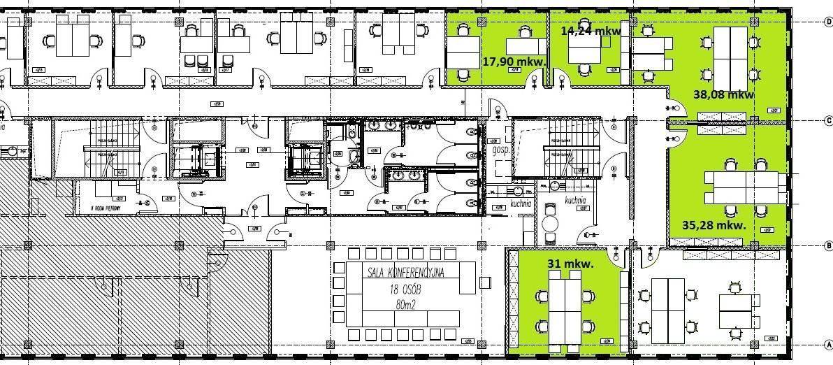 na II piętrze o powierzchni 35,30 mkw. + współczynnik powierzchni wspólnej 6,7 mkw. ( budynek klasy A)