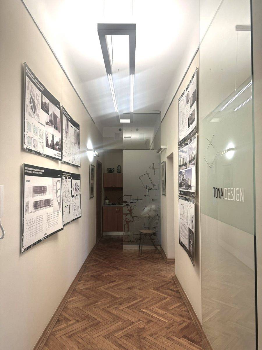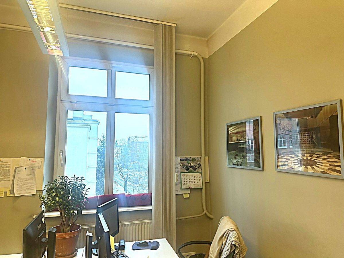 Lokal biurowy o powierzchni ok.114 m2 znajduje się na II piętrze kamienicy z 1928 roku i składa się z 4 pokoi: 26 m2, 22 m2, 22 m2, 22m2, małego aneksu kuchennego, łazienki 5,8 m2 i korytarza.