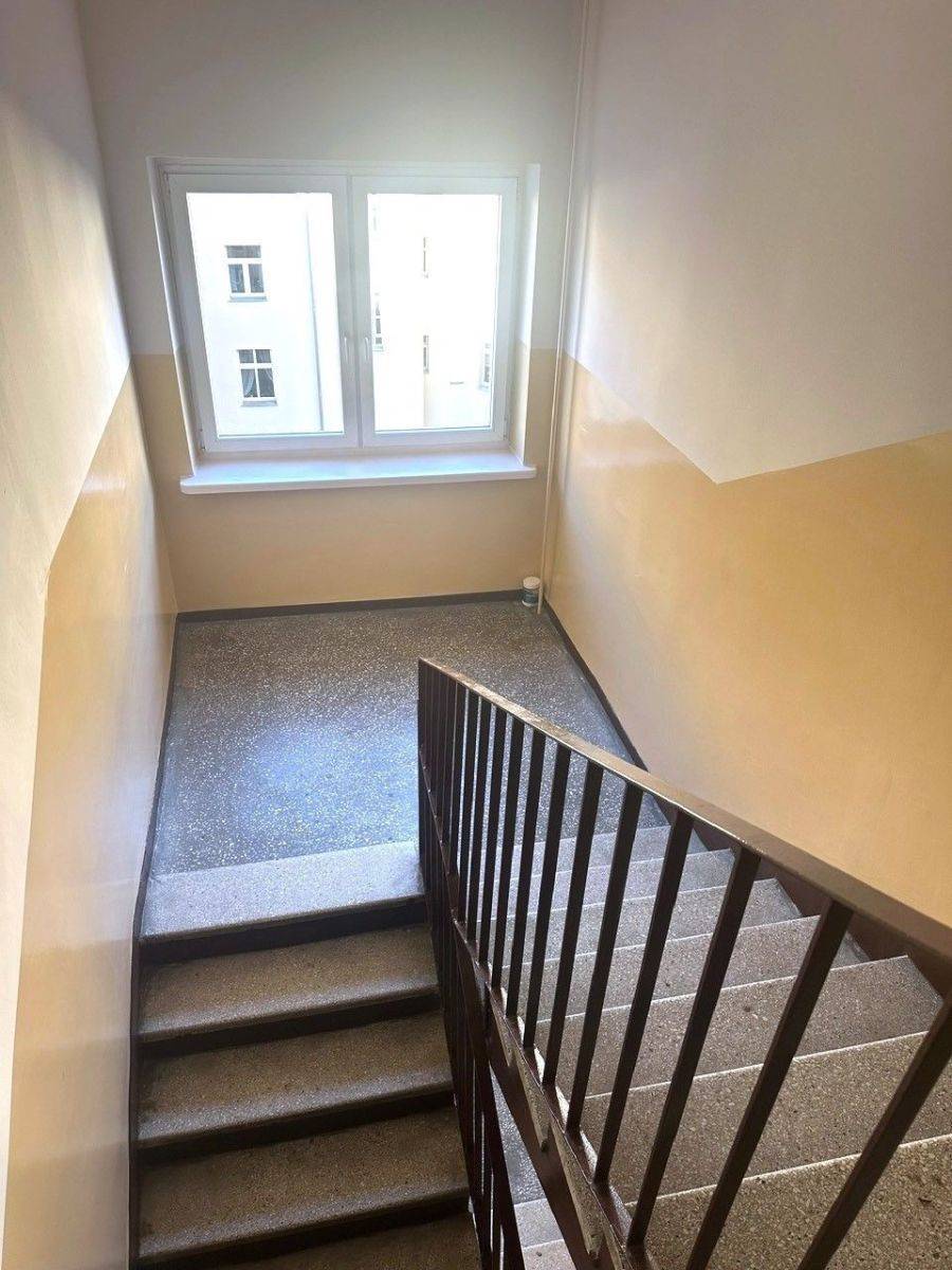 Wejściu do budynku, od strony podwórza, zadbana klatka schodowa. Czynsz do wspólnoty wynosi jedynie 405 zł miesięcznie.