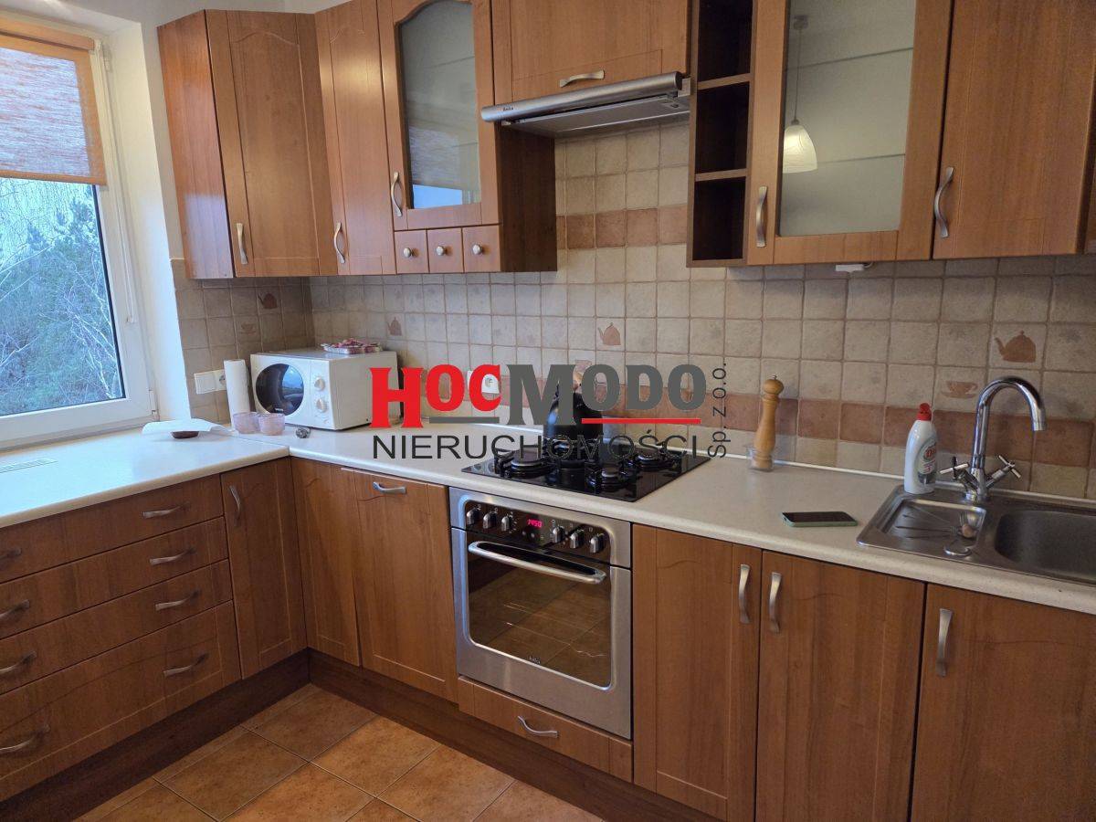 Lokal jest czysty, umeblowany. Kuchnia wyposażona w sprzęt AGD wraz z pralką w zabudowie. W salonie kanapa z opcją spania. Łazienka z oknem i wanną. Duże szafy w zabudowie w sypialni i przedpokoju. Oczywiście jest możliwość doposażenia w zależności od potrzeb lokatorów. Na podłogach klepka drewniana i kafle w kuchni oraz w łazience. Duża loggia z widokiem na zieleń. Do lokalu przynależy piwnica.