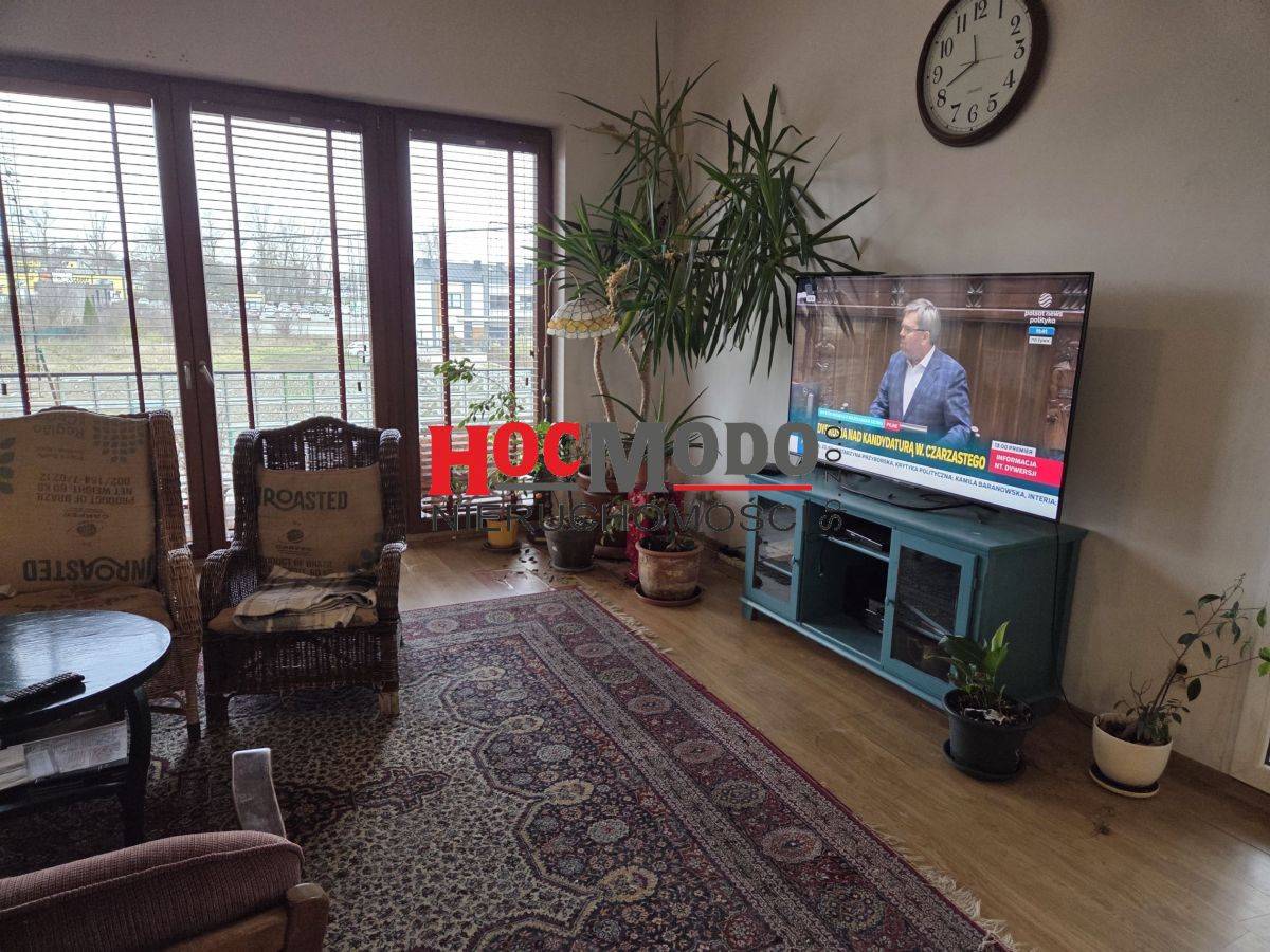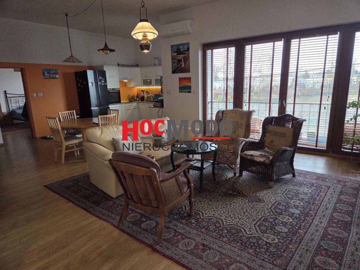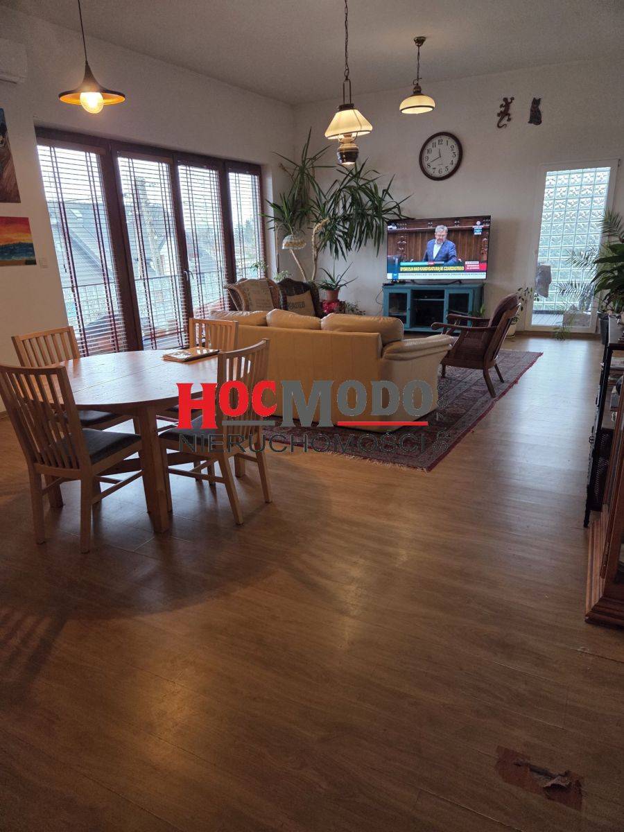 Z salonu jest wyjście na balkon od frontu budynku oraz wyjście na drugi, zadaszony i przeszklony taras z drugiej strony budynku. Do części mieszkalnej przynależy też garaż w bryle budynku i część piwniczna.