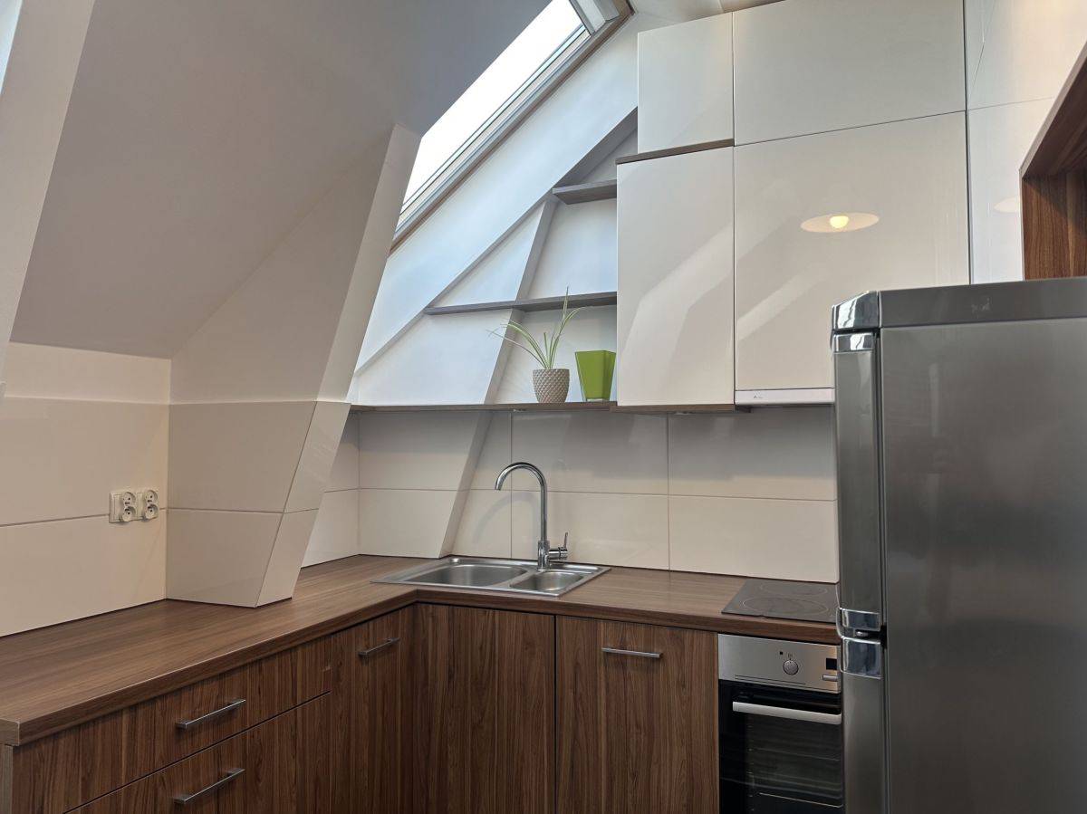 Mieszkanie wykończone w nowoczesnym, harmonijnym stylu z zachowaniem elementów stylizacji obecnych w kamienicach (cegła) składa się z korytarza, jasnego salonu z aneksem kuchennym, sypialni z oddzielną garderobą oraz łazienki. Mieszkanie ze skosami. Bardzo jasne i słoneczne.