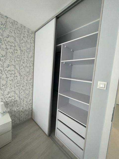 Sypialnia to komfortowe podwójne łóżko, obszerna szafa w zabudowie oraz biurko z krzesłem, zapewniające wygodę zarówno do odpoczynku, jak i pracy. W korytarzu znajduje się jeszcze jedna, pojemna szafa w zabudowie. Łazienka wyposażona jest w kabinę prysznicową, umywalkę na szafce z szufladami, wiszącą szafkę oraz pralkę.