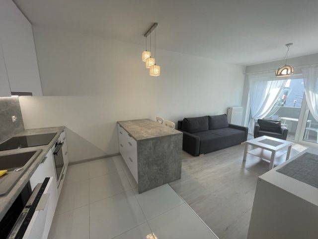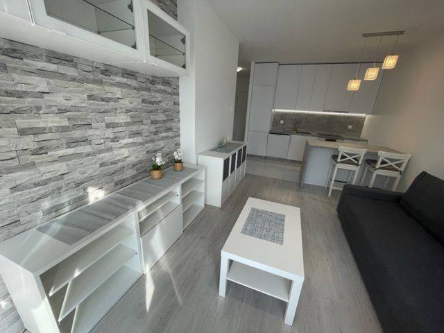 Mieszkanie jest w pełni umeblowane i wyposażone w wysokim standardzie. W salonie znajdują się rozkładana kanapa, ława, szafka RTV z telewizorem, elegancka witrynka oraz pojemna komoda. Kuchnia zabudowana jest meblami z licznymi szafkami, wyspą z szufladami oraz wyposażona w sprzęt AGD: zmywarkę 60 cm, dużą lodówkę z zamrażarką, piekarnik, płytę indukcyjną i podszafkowy okap.