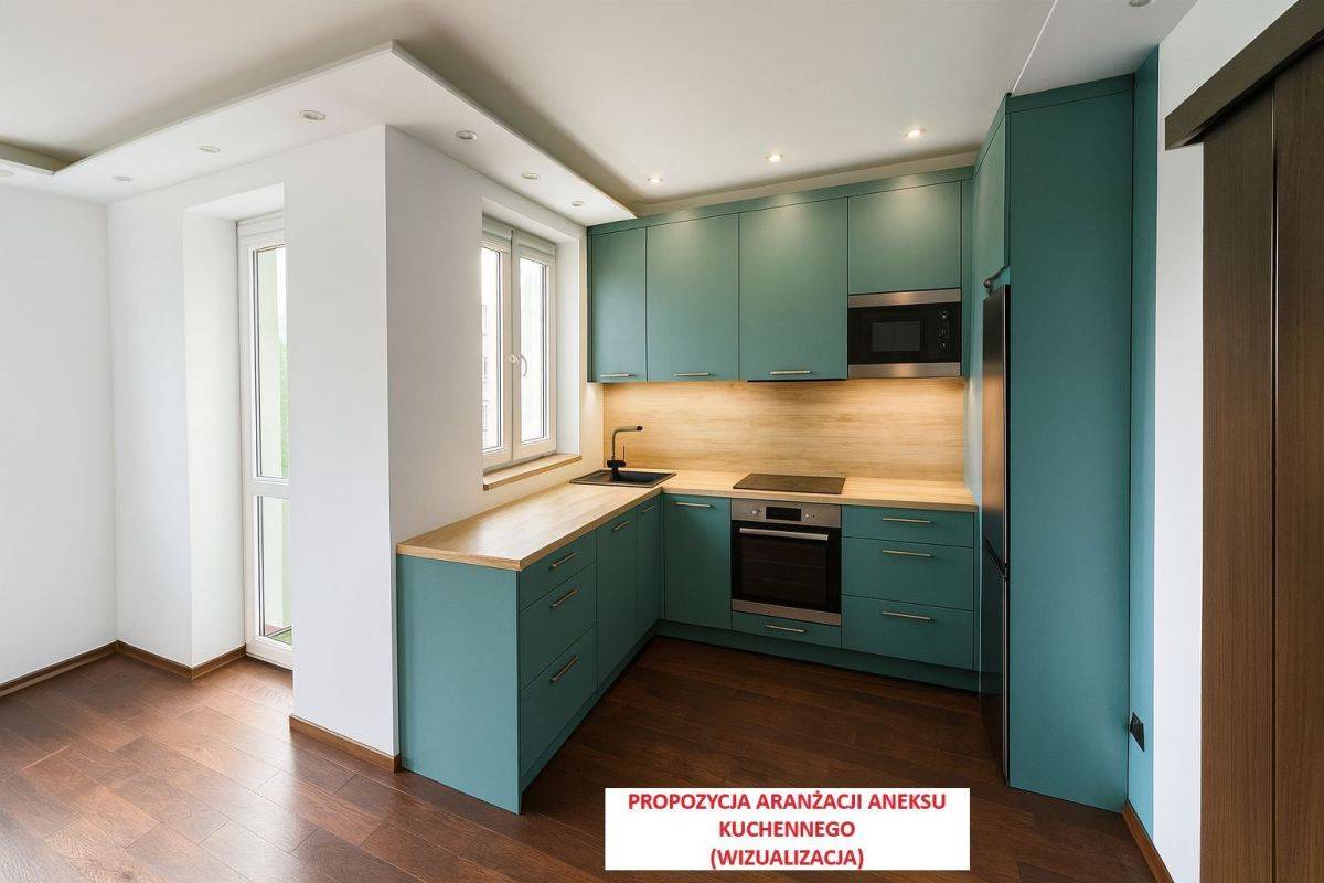 Istnieje możliwość zmiany układu i przerobienia mieszkania na trzy pokoje - wystarczy w salonie urządzić aneks kuchenny!